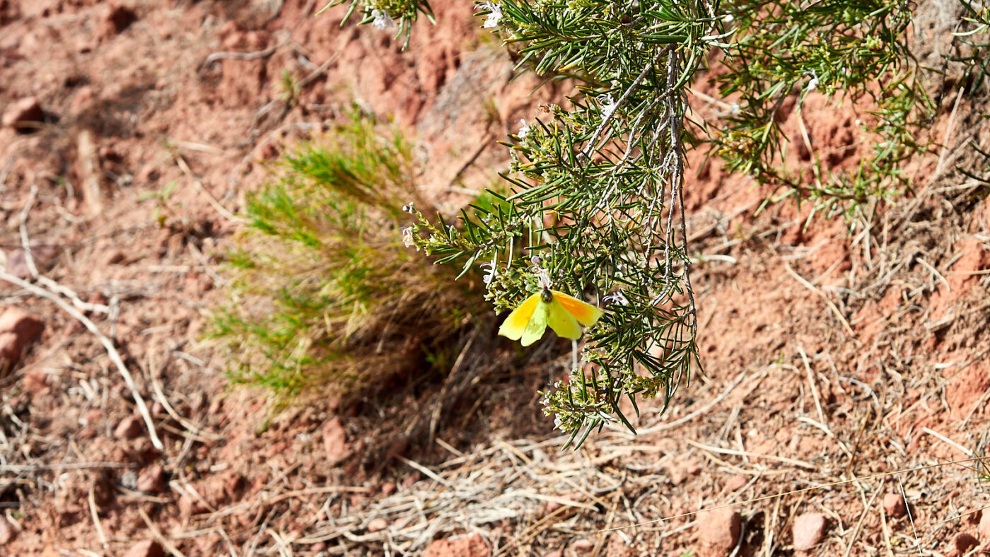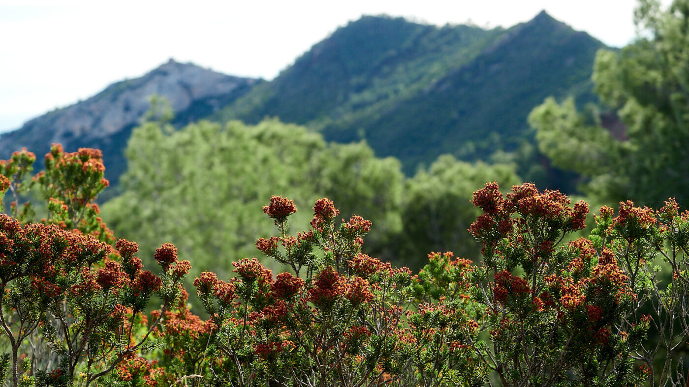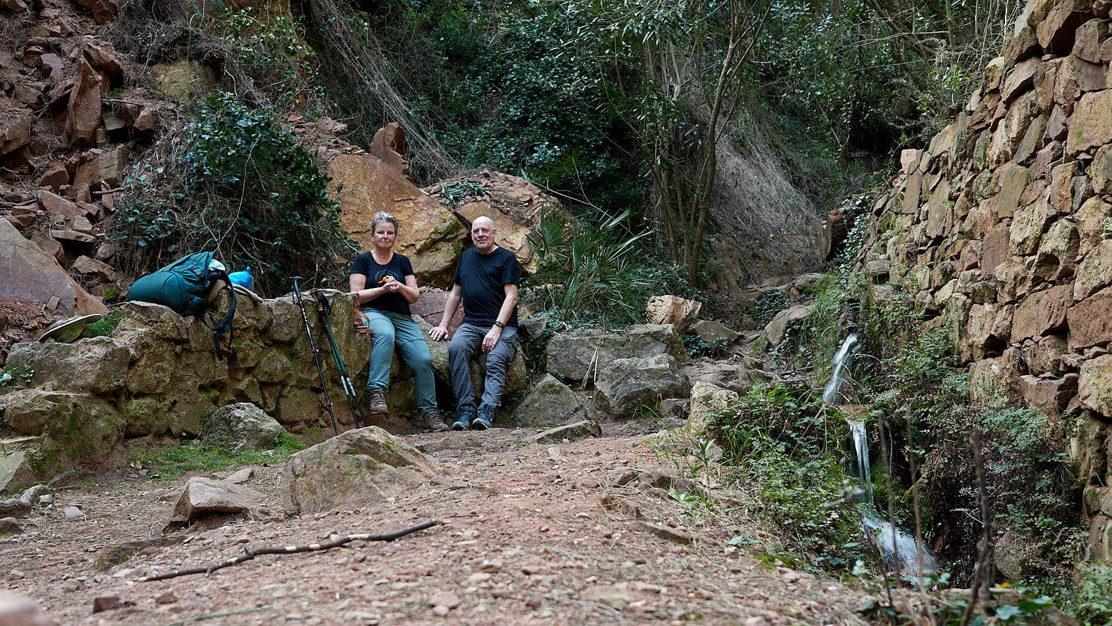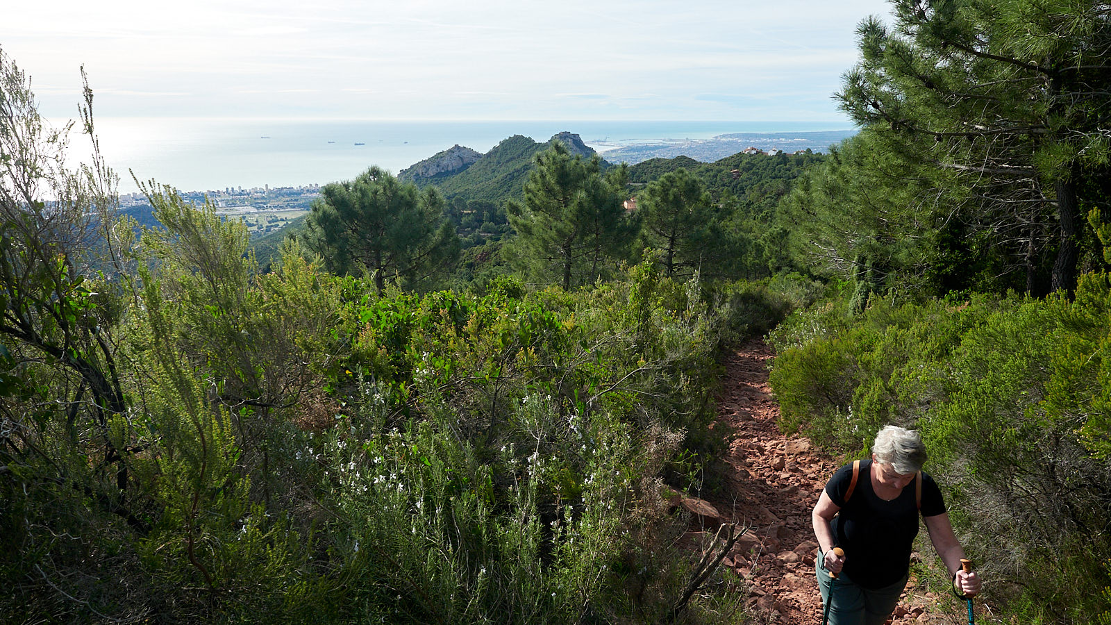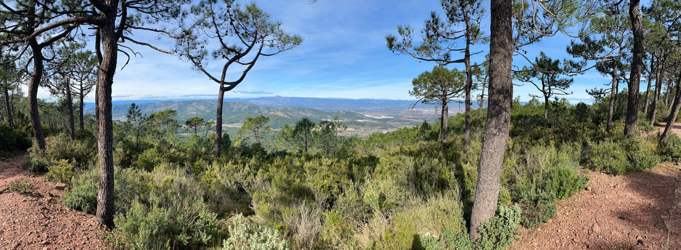 Wat een tocht, dan weer een stuk met beton versterkte weg, daarna de meest gruwelijke rollende split, kranzinnige steile stijgingen of supersmalle gootjes waar je je voeten vóór elkaar moet zetten. Gelukkig hadden we de wandelstokken mee, zonder had niet gekund. Evengoed vraag ik me af of twee 67’ers wel zo’n route moeten lopen. Niet omdat’ie zo gevaarlijk of spannend is, maar omdat’ie echt belachelijk zwaar is door de almaar wisselende passages, met onbegaanbare ondergronden en absurde steiltes. Maar daartegenover staat dat we door een waanzinnig mooi natuurgebied lopen, op hoogtes tussen de 240 en 720 meter boven de zeespiegel en met dús een steeds wisselende horizon (want het gaat almaar omhoog en omlaag) en variërende zonnestand (want een pad met zulke hoogteverschillen kan niet anders dan heel erg slingeren). Onze wandelapp toont dat we 630 meter stegen (accumulatief) en 660 meter in hoogte afdaalden. Zou onze auto dan niet 30 meter lager moeten staan als we er bij terug komen? Dat blijkt niet zo te zijn. Misschien helaas, want die laatste dertig hoogtemeters waren écht de laatste loodjes.
