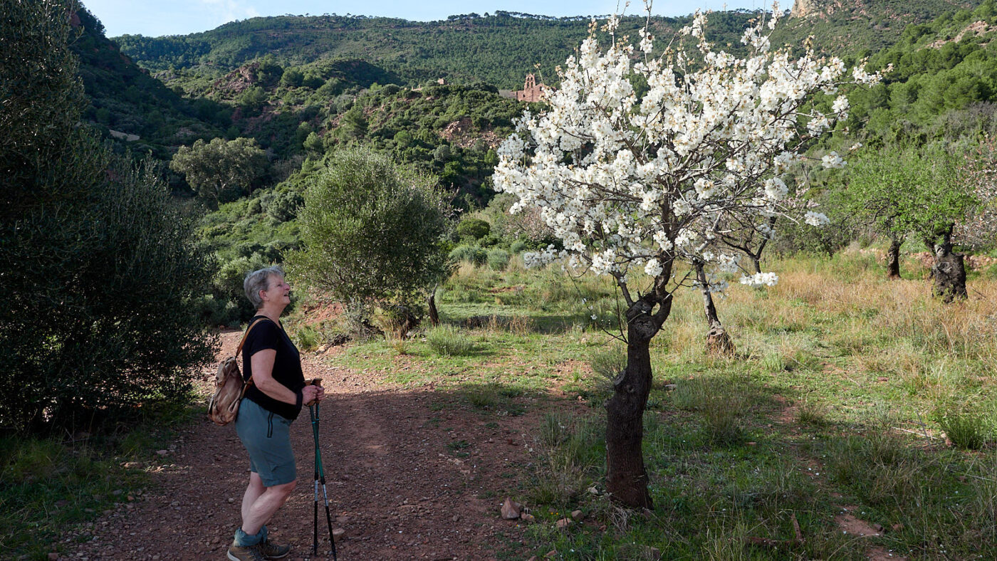 Het Desert de les Palmes is een natuurgebied op een half uurtje rijden van onze camping in Benicàssim. Hoe dat met die palmen zit snappen we niet, pas na een half uur komen we de eerste tegen, een wat sneue excuus-waaierpalm weggedrukt in de berm van het pad. Later komen we er wel wat meer tegen, maar het lijkt erop dat het hier een dus palmenwoestijn is, een gebied met weinig palmen. We lopen de route van de Monestir dels Carmelites, een klooster van de orde der Karmelieten, waar ik verder weinig van weet, maar waar ik toch een positieve associatie mee heb, dankzij het Tripel Karmeliet, een superieur Belgisch bier van brouwerij Bosteels (8,4 procent). Maar dit terzijde.