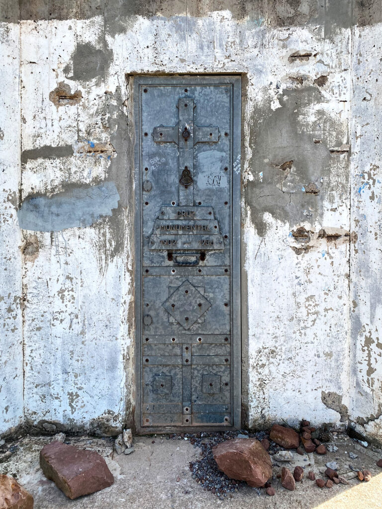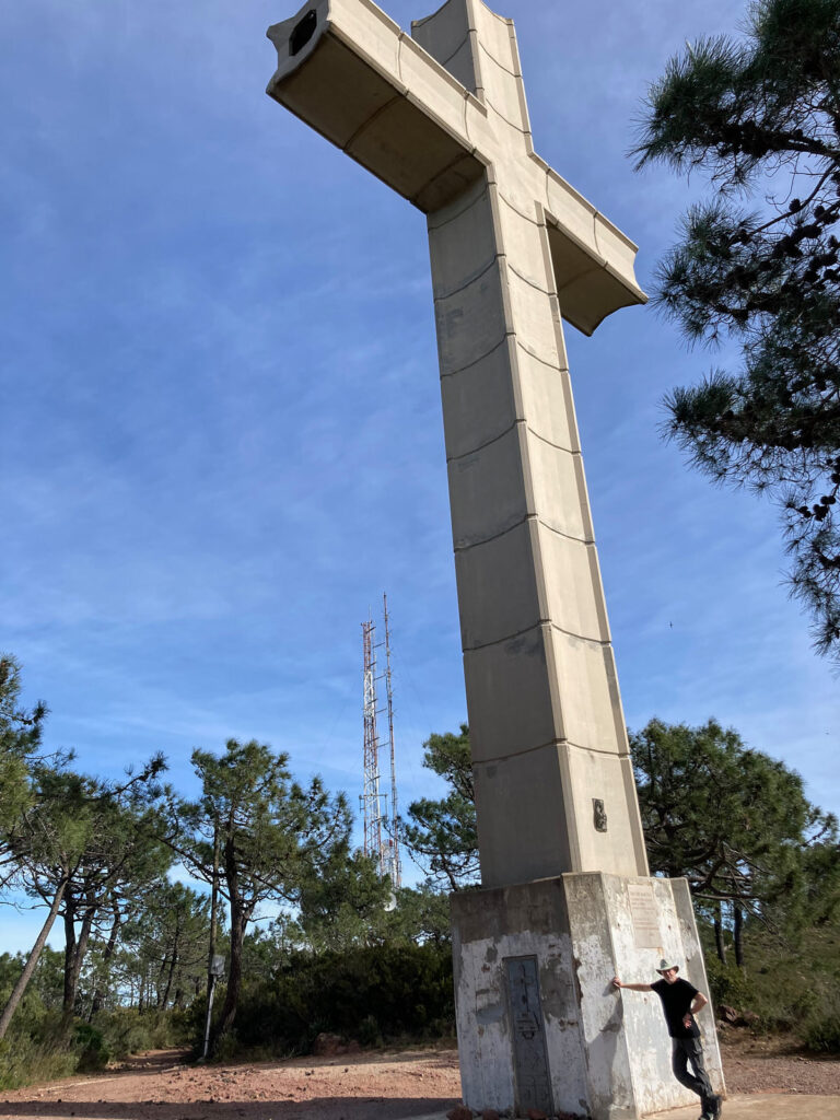 De route loopt langs maar liefst twee karmelietenkloosters: een ruïne en een nieuwe. Maar dat is pas na 12 kilometer. Vanaf de parkeerplaats (tegenover het nieuwe klooster/museum) gaat het al meteen omhoog en niet zo’n gutvergoten beetje ook. De ondergrond bestaat uit de meest wipelturige rolkeien op de aardbol, waardoor het een Sisyphuskwelling wordt om omhoog te komen. Het gaat in 2,5km van 440 meter naar 710 meter hoog, naar de top van de Bartolo, die als een speldenkussen helemaal met radio-antennes is volgeprikt. Vlak ervoor staat een immens kruisbeeld, gewijd aan Bartolo, aan de voet waarvan ik hemels slank door Corrine op de foto wordt gezet. Is er dan toch een heiland?