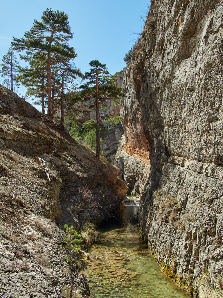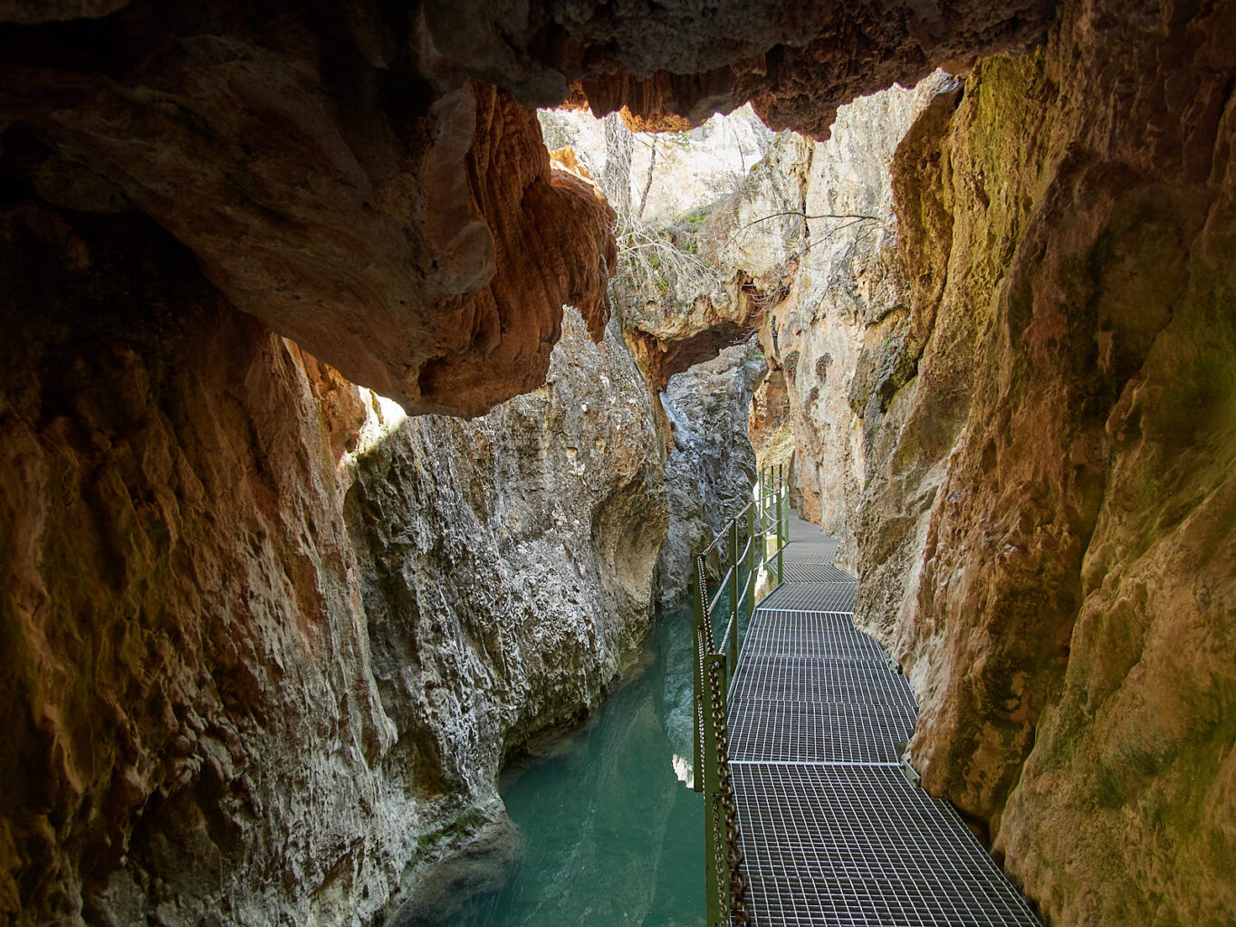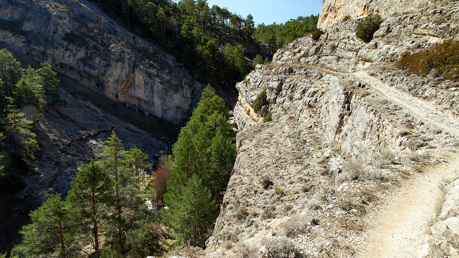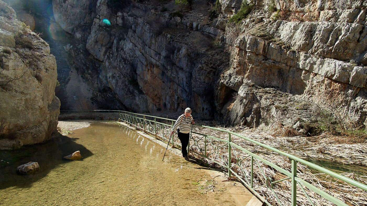 De wandeling begint net buiten Calomarde. Aanvankelijk is er een aangelegd wandelpad, met muurtjes en lantaarnpalen. De vele regen in de voorgaande weken veroorzaakt niet alleen een hoog waterpeil van de rivier, maar ook stroompjes die uit de bergwanden komen om zich bij de rivier te voegen. Het pad is daardoor op veel plaatsen overstroomd. Met gympies kom je niet ver, maar met bergschoenen en stokken gaat het prima. Die blijken later ook zeer van pas te komen, want door de smalte van de kloof moét het pad wel de kloofwand op. Dan kom je dus te lopen op wat ik substraatbalkons noem. Ze zijn soms erg smal. De overheid heeft op een paar plekken zelfs kettingen gespannen, zodat je je met een hand zekeren. Niettemin is het een uitdagende wandeling, fysiek intensief en op sommige stukjes best een beetje spannend. Maar wat krijg je daar voor terug?