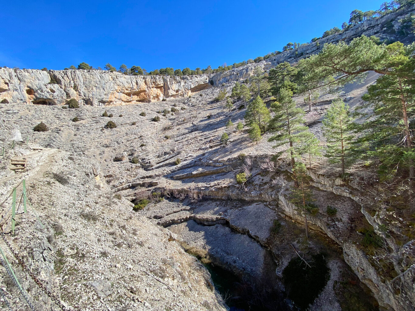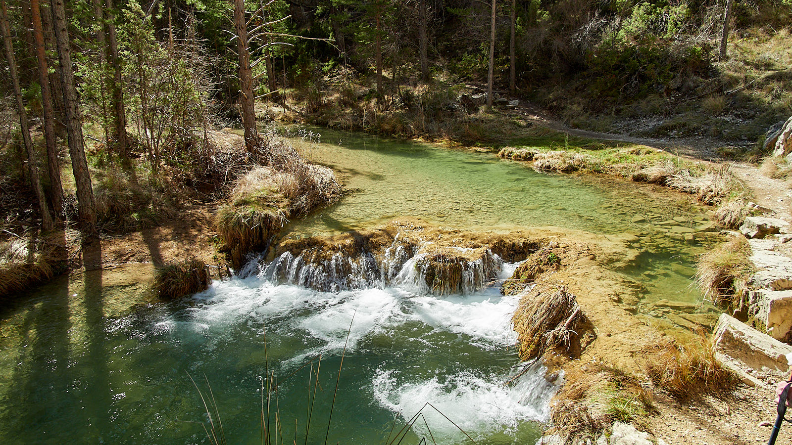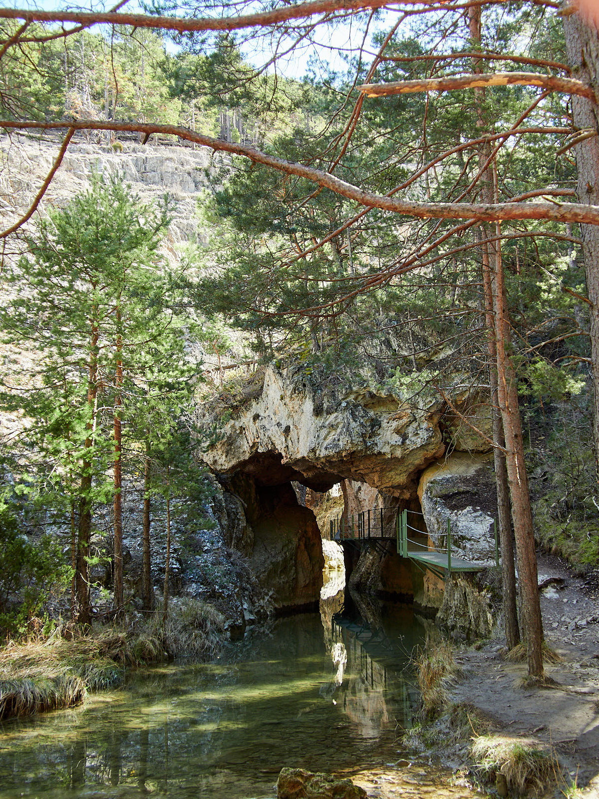 De wandeling begint net buiten Calomarde. Aanvankelijk is er een aangelegd wandelpad, met muurtjes en lantaarnpalen. De vele regen in de voorgaande weken veroorzaakt niet alleen een hoog waterpeil van de rivier, maar ook stroompjes die uit de bergwanden komen om zich bij de rivier te voegen. Het pad is daardoor op veel plaatsen overstroomd. Met gympies kom je niet ver, maar met bergschoenen en stokken gaat het prima. Die blijken later ook zeer van pas te komen, want door de smalte van de kloof moét het pad wel de kloofwand op. Dan kom je dus te lopen op wat ik substraatbalkons noem. Ze zijn soms erg smal. De overheid heeft op een paar plekken zelfs kettingen gespannen, zodat je je met een hand zekeren. Niettemin is het een uitdagende wandeling, fysiek intensief en op sommige stukjes best een beetje spannend. Maar wat krijg je daar voor terug?