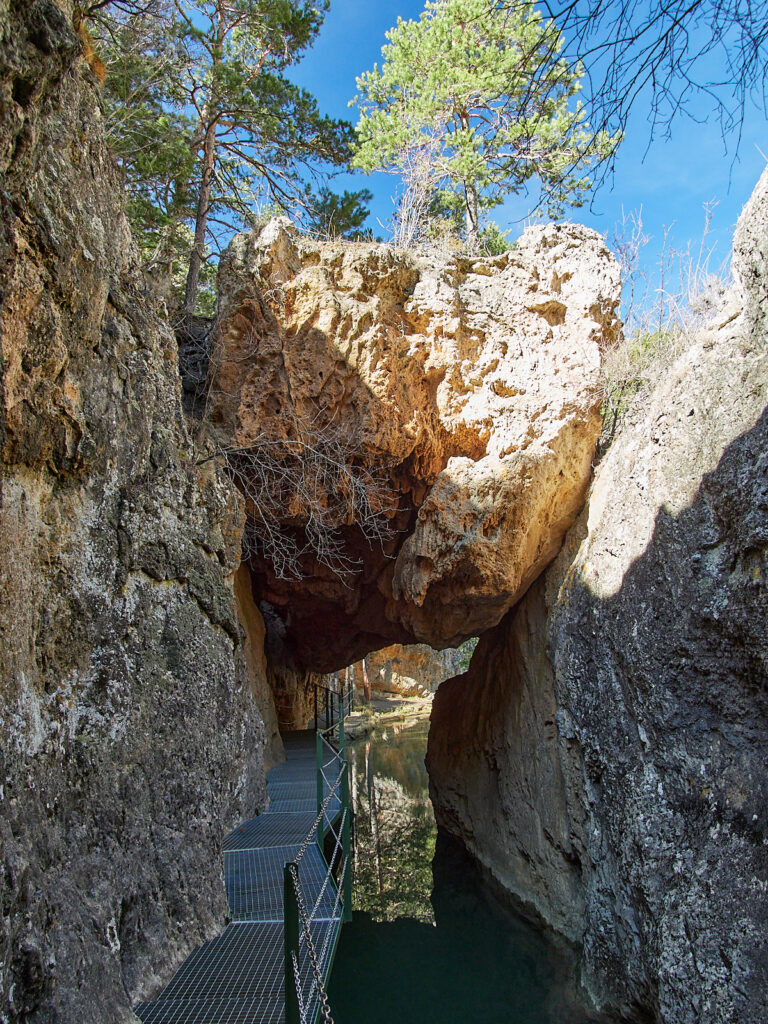 Je komt zintuigen te kort tijdens deze wandeling. Je moet goed opletten hoe en waar je loopt, want een uitglijer betekent een val van misschien wel twintig of dertig meter. Maar de omgeving eist continu je aandacht op, want vervult je met pure vreugde. Dus je wilt ook om je heen kijken. Je moet. Hier zijn, betekent ook er helemáál zijn en je eraan overgeven. Waar het pad te gevaarlijk werd, of onmogelijk, bouwden ze metalen bruggen die aan de wand hangen. Je komt boven het water te lopen, tussen de beide zijden van de kloof, die je bijna tegelijk kunt aanraken. Bij de bogen (los arcos) moet je bukkend onder het gesteente door. Erbovenop groeien bomen. Het geheel van sensaties laat je niet alleen fysiek, maar ook mentaal versmelten met de omgeving.