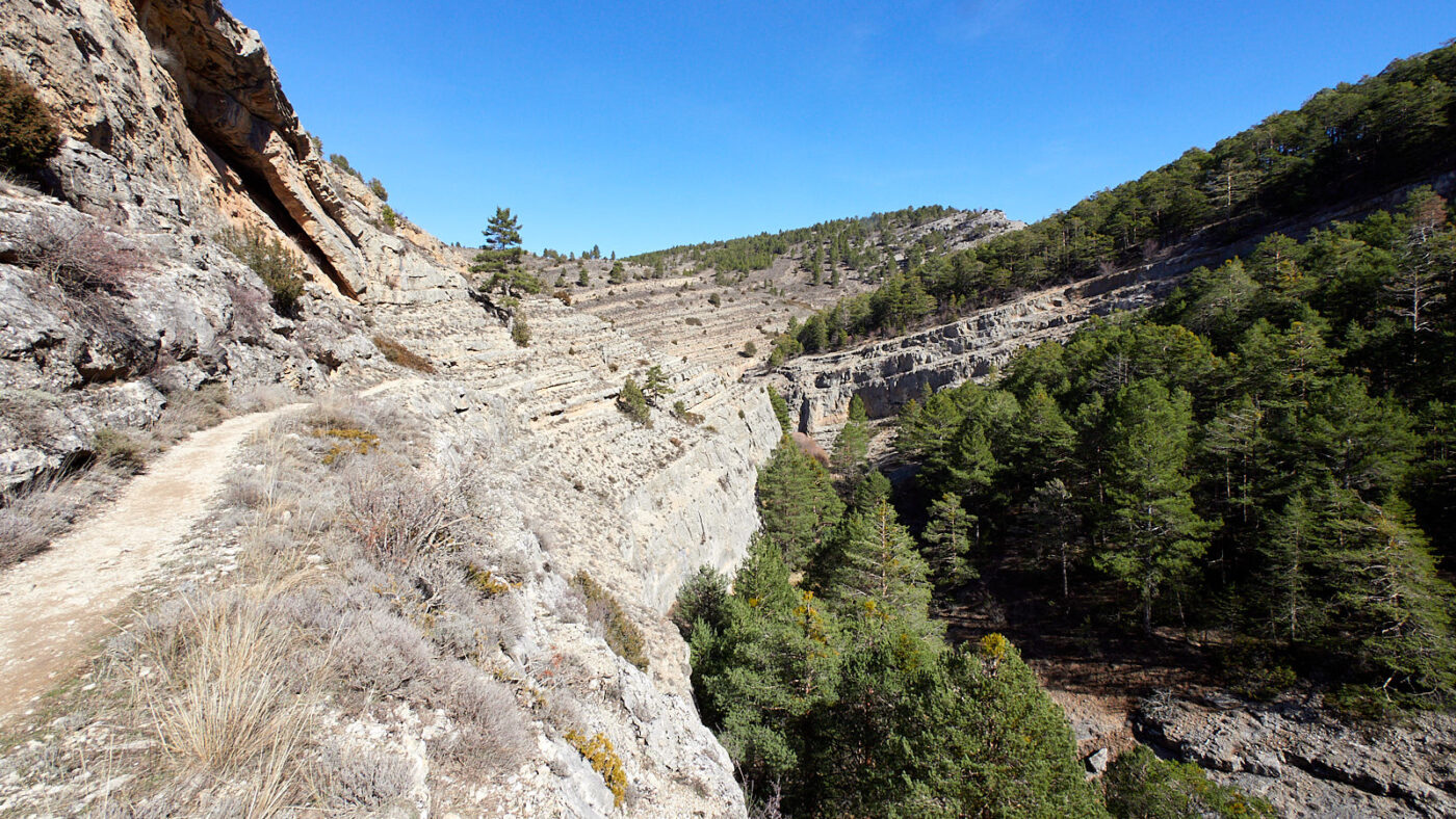 We komen vandaag te lopen op maximaal 1420 meter hoogte. Gelukkig hoeven we niet op het waterniveau van de Middellandse zee te starten. De hoogvlakte waaraan onze sierra grenst, ligt namelijk al op ongeveer 1.000 meter en heeft een hoogste top van 1.856 meter. Hoe vreemd is het niet dat we hier weer op de zeebodem blijken te wandelen. De ondergrond is sedimentair en extreem gelaagd. Ons pad gaat voor een groot deel over zulke bodemlagen die uitsteken alsof het balkons zijn. Op sommige punten zien we weer ‘salto’s’; waar de laag verticaal gekruld is. Dat we zo goed kunnen zien hoe de miljoenen jaren oude ondergrond is opgebouwd, komt door de Rio Blanco. Je kunt zelf wel bedenken waarom dat riviertje die naam heeft gekregen. Het wilde water sleet vanaf het begin der tijden een diepe kloof in de rotsen, zodat onderzoekers zonder te boren tot diep onder het oppervlak kunnen kijken. Geologen ontdekten dat stukken van de sierra zelfs dateren van vóór de grote continentale drift.