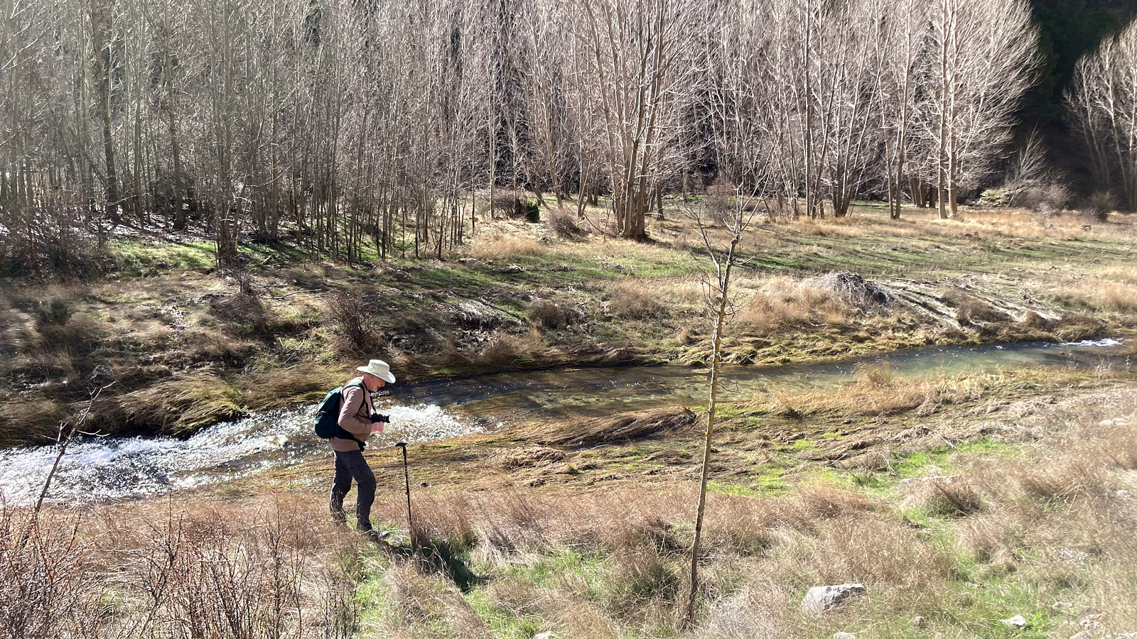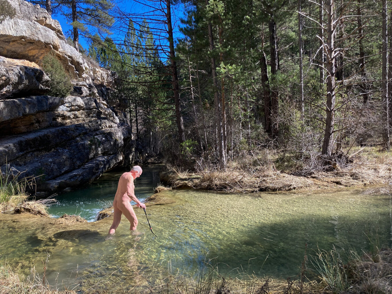 De temperatuur is een genadige 18 a 19 graden. Maar het ene moment loop je dertig meter boven de rivier, op een smal pad tegen een kale rotshelling in de brandende zon. Het volgende moment, na een steile afdaling, kom je terecht op een strookje verende bosgrond onder dennenbomen en is de schaduw weldadig koel. Bij een bocht in de rivier, waar de zon een van de kloofflanken verwarmt, gooi ik alles uit en stap onvervaard in het water. De felle stroming zuigt aan mijn benen, de ondergrond is van lichtgroene alg en glad. Ik schuifel voorzichtig naar een wat dieper stuk om mij zachtjes in het koude nat te laten zakken. Aan koud douchen ben ik gewend, maar dit is toch van een andere orde. Maar daarom niet minder heerlijk, want ik voel mij verwelkomd en opgenomen in de pracht van de natuur hier. Het juiste woord is: één. Daarna ben ik blij weer wat op te warmen in de zon met een energiereep en wat te drinken.