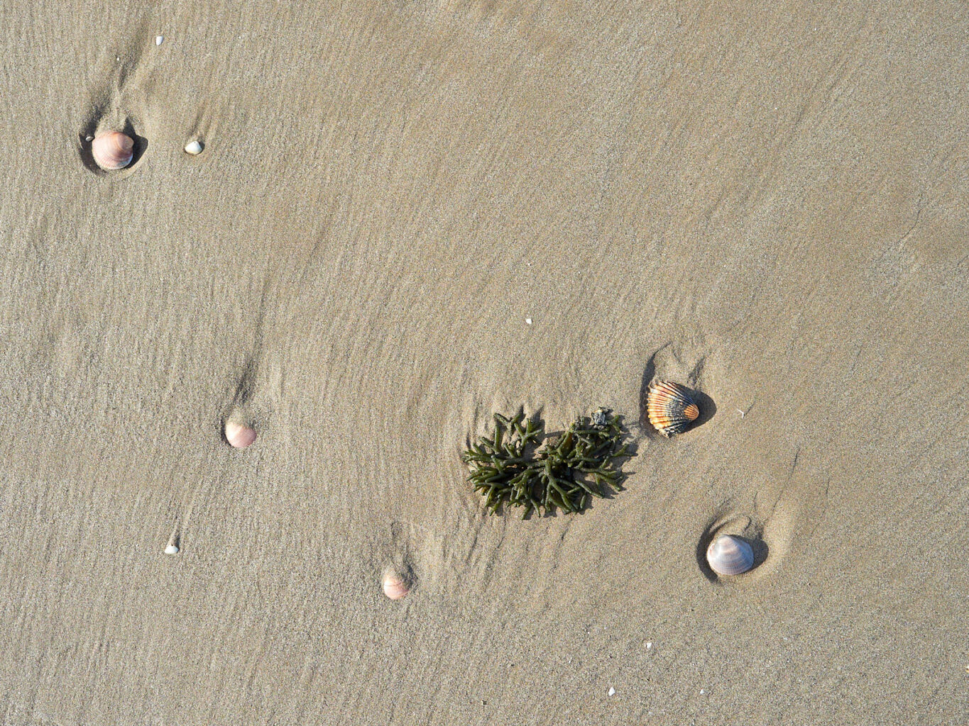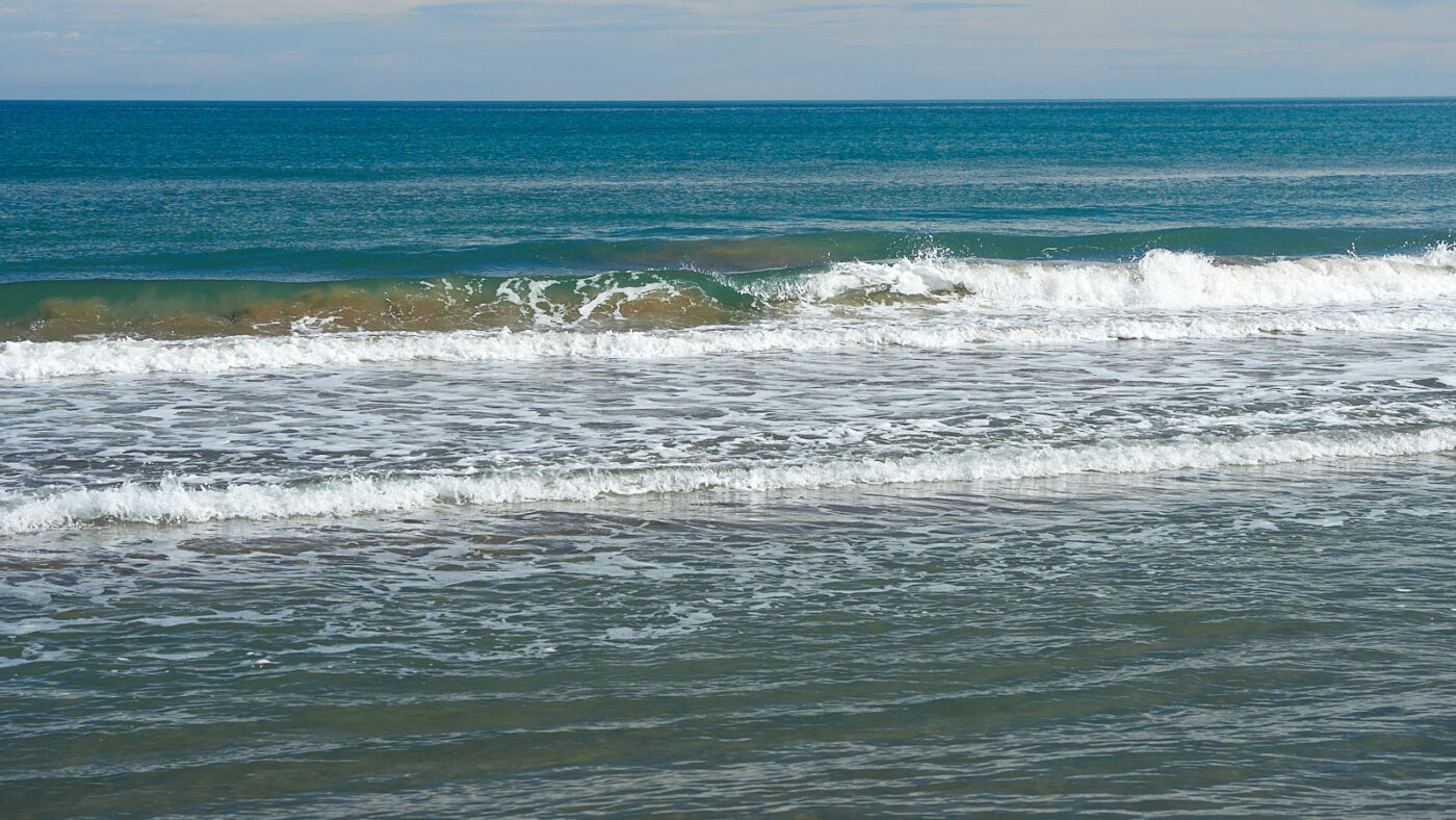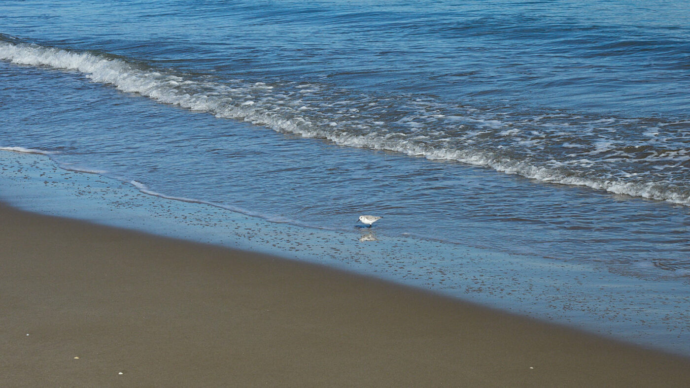 En zo trekken we weer een paar uur op met de zee, die als speelse metgezel telkens een bruisende aanval op onze stappen doet en zich dan terugtrekt, talloze in het zand geblazen bubbeltjes achterlatend. Rappe drieteens strandlopertjes, verreweg de grappigste vogeltjes die er zijn, razen als bezeten op de holletjes af alsof ze elk belletje persoonlijk willen lekprikken. Maar het lijkt alsof ze hun pootjes niet willen nat maken, want voor elke golf rennen ze weer terug omhoog. En als wij té dichtbij komen, vliegen ze allemaal tegelijk op, alleen om tien meter verderop weer te beginnen met rennen. Er komt geen eind aan dit vrolijke ballet van mens en dier op het podium van het natte zand. De zon vindt telkens nieuwe openingen in het halfopen wolkendek en kleurt de zee soms zilver en dan weer alles tussen aquamarijn en turkoois. In de aanrollende golven zie je, vlak voordat hun golftoppen in tuimelende schuimmassa’s teloor gaan, de (argeloze) zandkorrels weer, die van de zeebodem zijn omhoog gezogen, alleen om opnieuw met geweld over het strand te worden uitgespreid. Wat een feest voor de geest. Ik wil elke dag wel een strandwandeling maken.