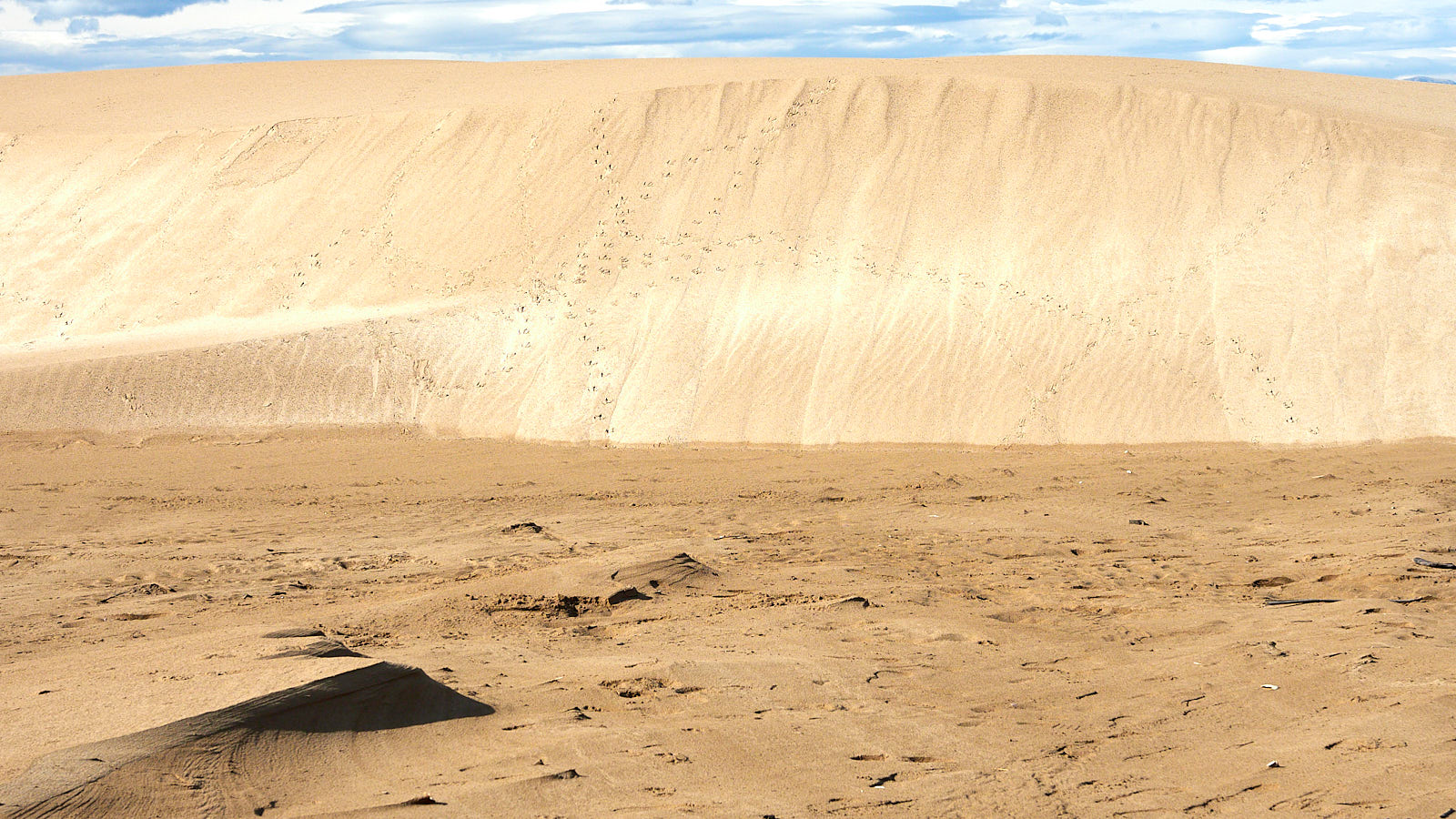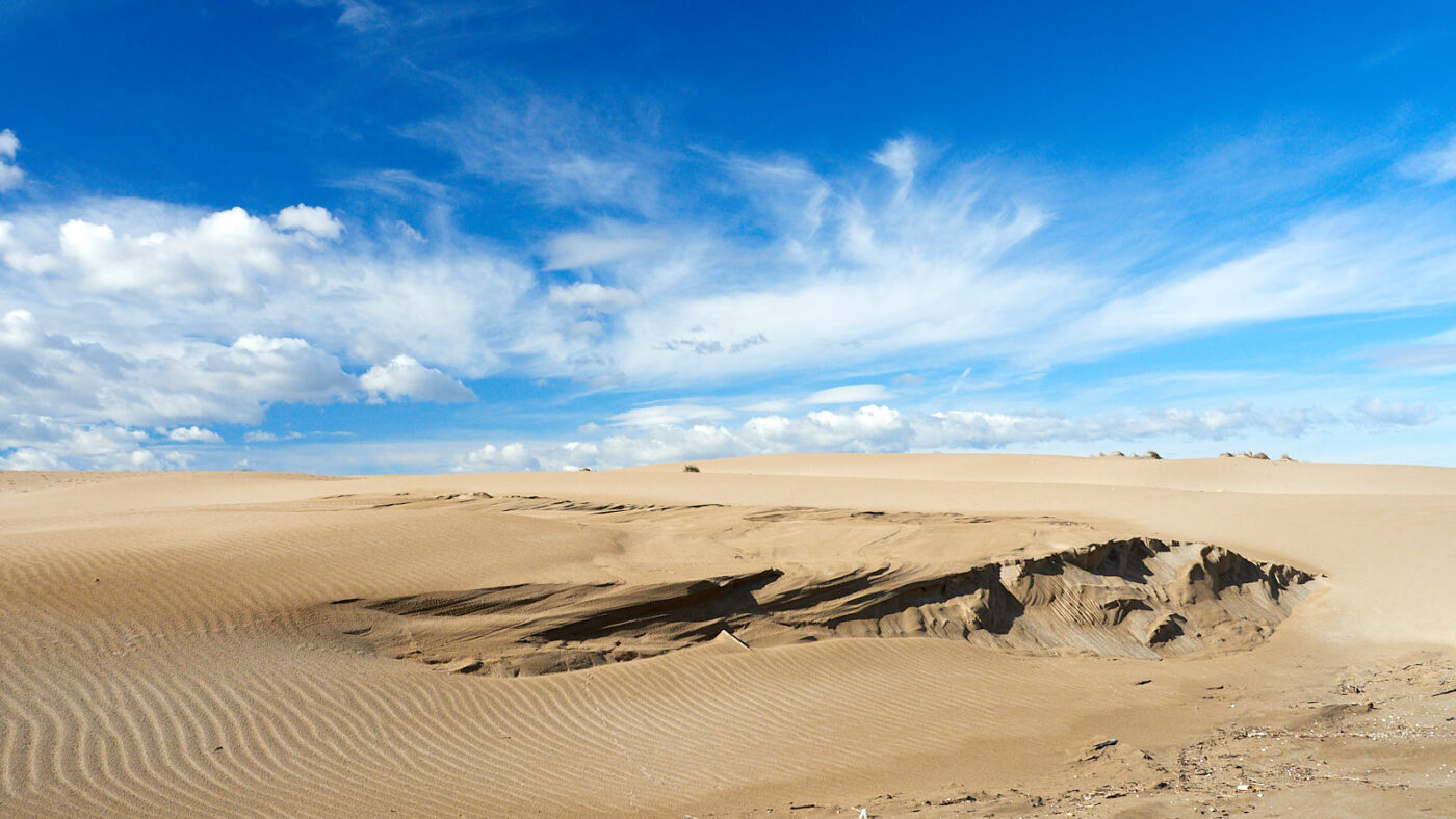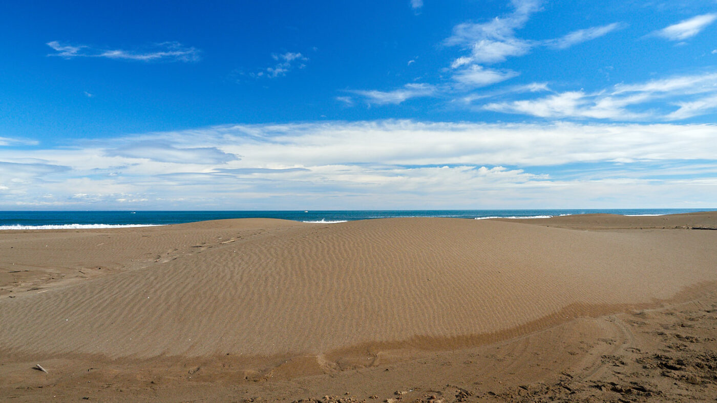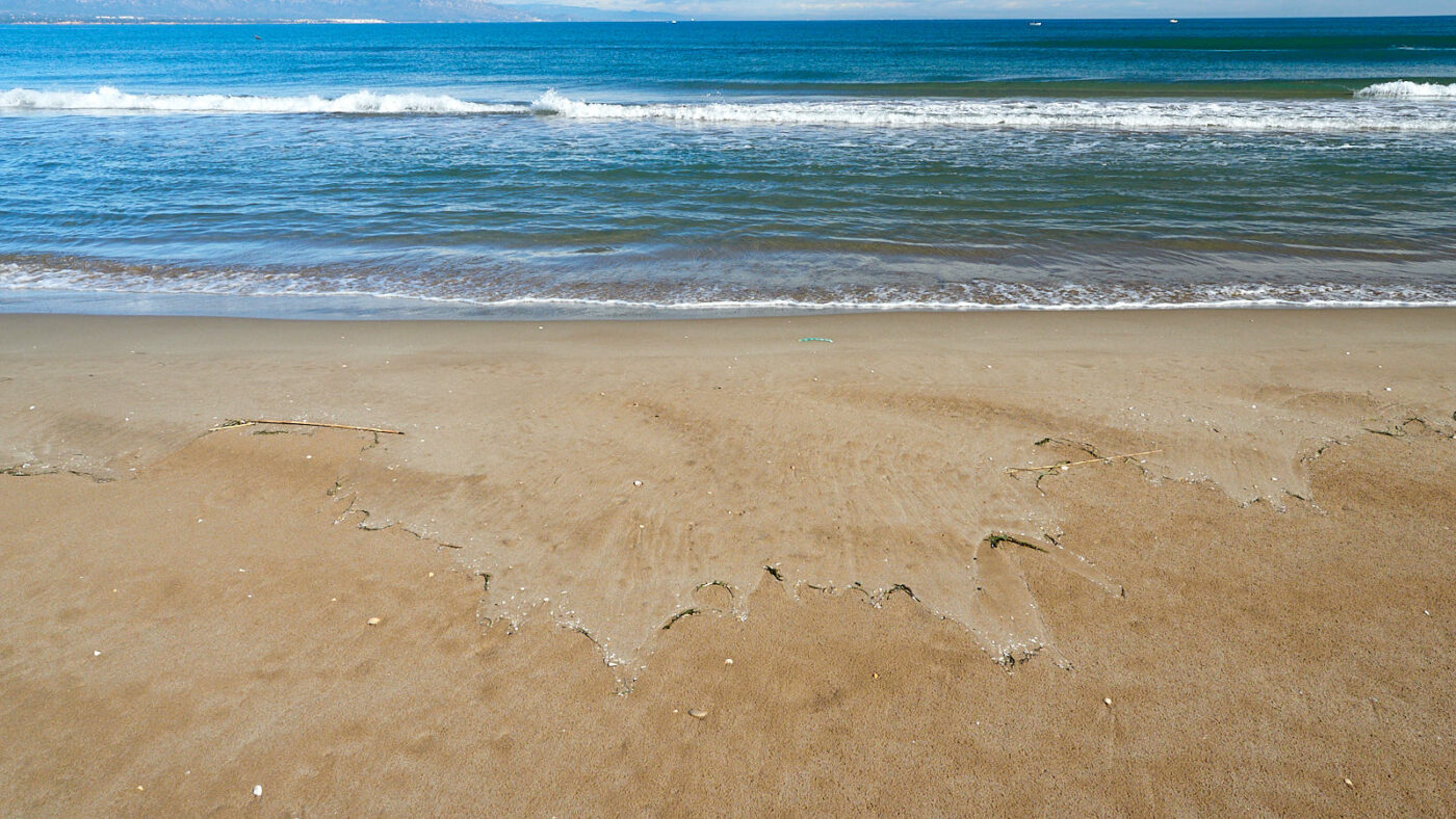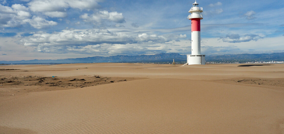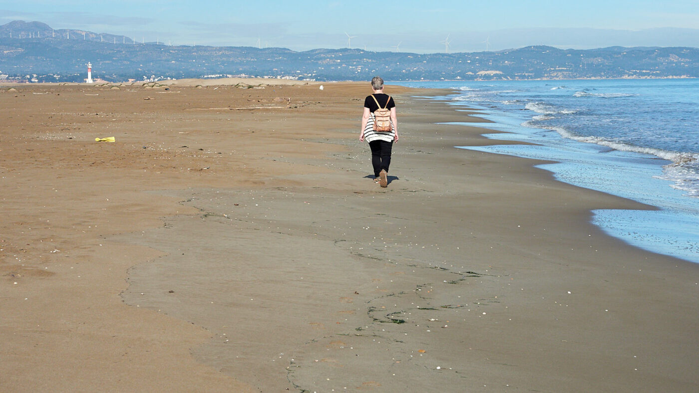 Het maakt onze wandeling naar de vuurtoren van Fangar (Far del Fangar) er niet minder aantrekkelijk op. Het hele stuk ís namelijk beschermd. Bezoekers wordt gevraagd de duinen niet te betreden. Alleen direct aan het strand mag je lopen. De wandeling verschilt echt wezenlijk van die we gisteren aan de zuidkust deden. Aan de zeekant is veel meer achtergrond aanwezig in de vorm van bergen op het vaste land van Spanje en aan de baaikant is er de telkens veranderende aanblik van duinen, waarboven de lucht trilt alsof het al zomer is. Het zand onder onze voeten is meestal stevig en heeft een donkerder kleur dan de duinen. Maar soms ligt op het donkere stuk een grote lichtere plak, alsof daar een duin is lek geprikt en leeggelopen. Op het oppervlak ervan trekt de wind lange ritmische golven in het zand. Telkens als het hier stormt verandert het land, denk ik zo. Op de hellingen van de duinen zien we dezelfde windribbels, maar ook erosiesporen van regenval. Kennelijk stroomt hemelwater ook aan het oppervlak van zo’n duin omlaag, in plaats van alleen ín het zand te zakken. Het reliëf en de kleurverschillen verschaffen de meters hoge zandwand een bekoorlijke uitstraling, die nog versterkt wordt door vogelvoetstapjes die als colliers grillig tussen top en voet slingeren. Een paar meeuwen drijven op de warme luchtstroom erboven. Tussen de zandheuvels liggen platte zandstroken waarop zich alles heeft verzameld wat op de kust is aangespoeld. Helaas zit daar nogal wat afval tussen en dan komt de estheticus naar boven en zoek je naar composities die de ergste rommel buiten het kader houden.