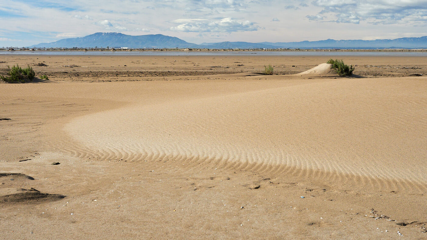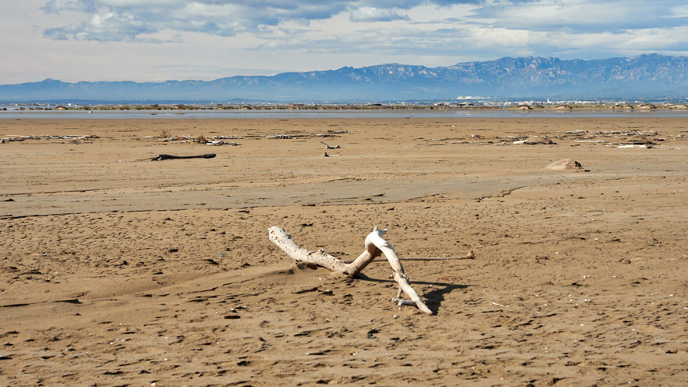 Vermetele zandkorrels die de kust bereiken, ze zijn er niet meer! De Ebro is namelijk in het gareel gebracht, haar loop is deels gekanaliseerd en -het ergste- er zijn drie stuwmeren aangelegd. Die waterbekkens zijn voor consumptie, irrigatie en elektriciteit van levensbelang. Zeker. Maar het betekent ook dat de stroming in het water op drie plaatsen tot stilstand komt. In het kalme water van een stuwmeer zakt het slib naar de bodem en komt de reis tot een einde. Knappe zandkorrel die drie van dat soort hordes weet te nemen. Geen kans. Gevolg is dat de delta al jaren niet meer groeit, in tegendeel; zij kalft af. Want de onvermoeibare zee knabbelt en knaagt aan haar kustlijn en voert zand af dat vanaf de andere kant niet meer wordt aangevoerd. Het laagland wordt bovendien serieus bedreigd door de stijgende zeespiegel. Grote delen van de delta liggen al onder het Middellandse zeepeil en het is alleen dankzij dammen en kanalen dat de huidige omvang behouden blijft. Tot dusver.