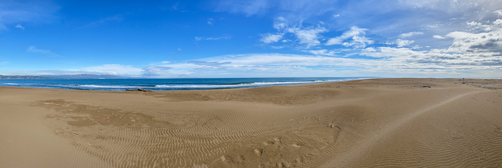 Net als gisteren blijkt de wandeling wat korter dan geadverteerd: 4,15km (keer twee). Dus dat is een makkie, ofschoon we wat vaker dan gisteren door los zand moeten ploegen en zo nu en dan noodgedwongen een duin-uitloper moeten nemen, omdat die tot in de branding reikt.