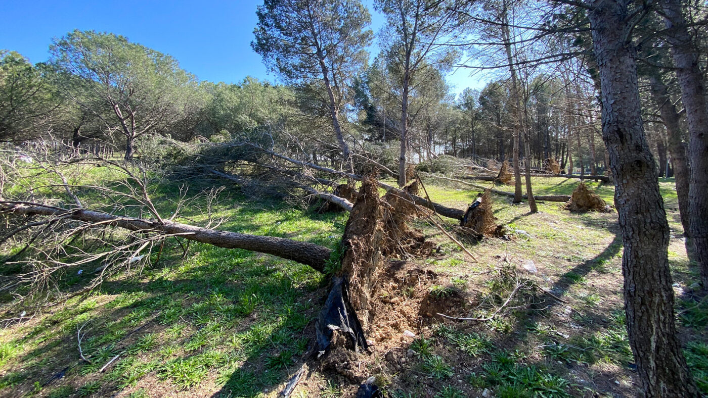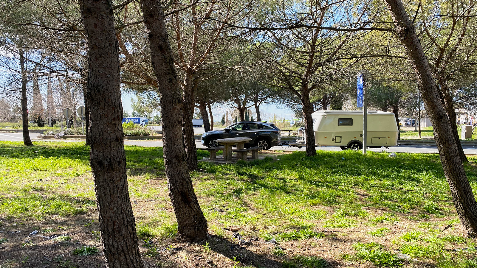 We vertrekken op ons dooie akkertje naar de volgende halte: Mondragon. Een alleraardigst dorpje in de Provence, even boven Orange. In Frankrijk dus. Ben je eenmaal over de grens, kom je op de riante Franse tolweg, kost een paar duiten, maar man wat reist het comfortabel na die wisselvallige Spaanse wegen. De zon schijnt hier, maar we zien nogal wat water op de velden liggen en op een aantal plekken zijn veel bomen omgewaaid. Zo ook op een van de rustplaatsen. Het moet hier vreselijk huisgehouden hebben.