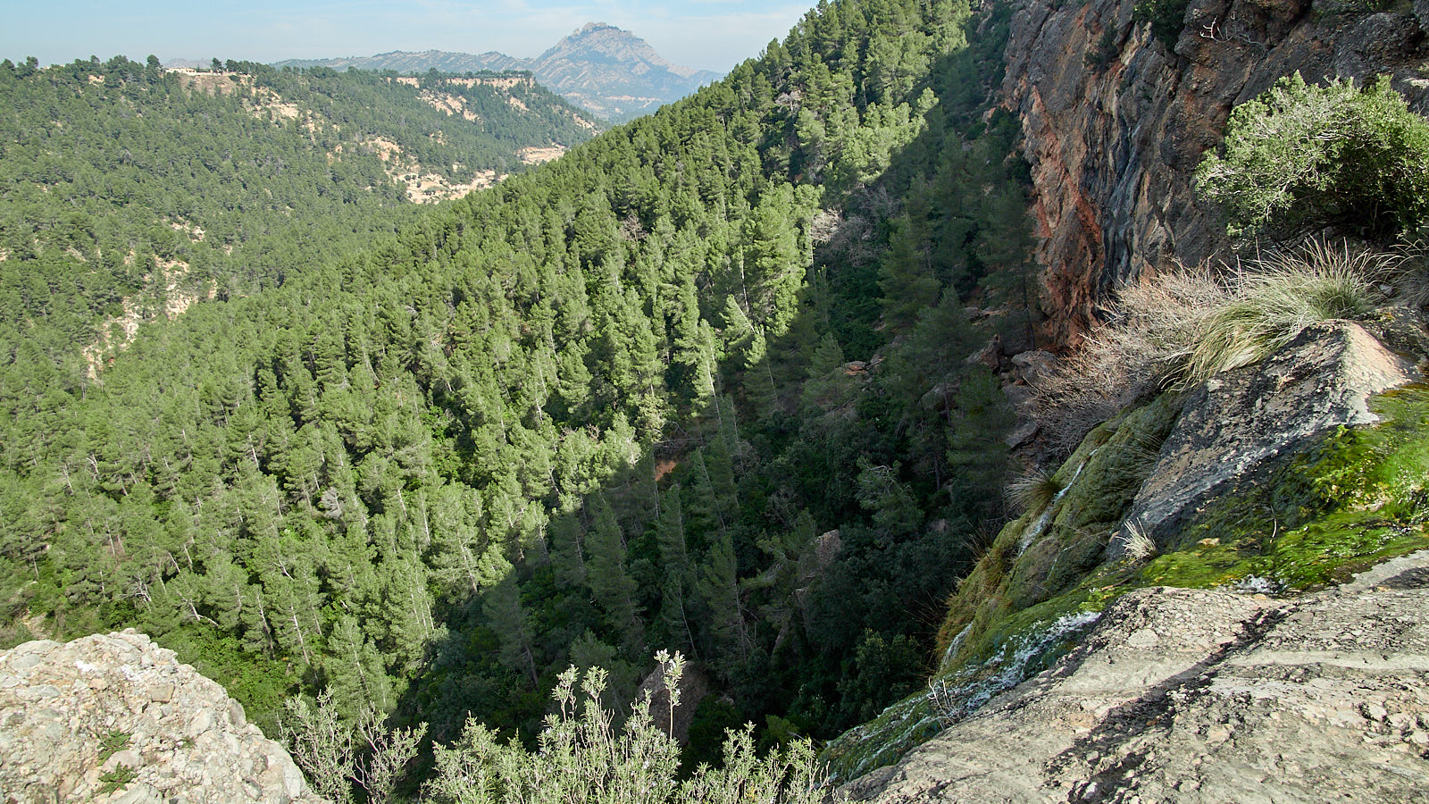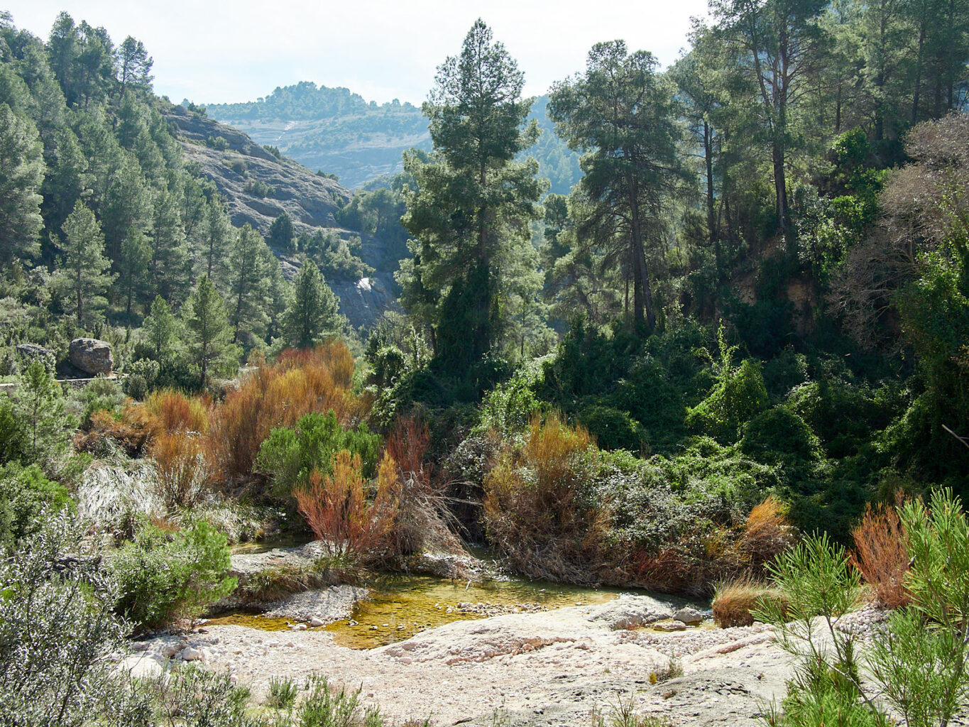 Bewust lopen we langzamer in de kloof, genietend van het constante ruisen, gorgelen en kolken van de stroom en van het fluiten, tsjilpen en zingen van de vogels. Als we dan tóch, sneller dat je zou willen, westelijk moeten afbuigen, terug naar het beginpunt, komen we opnieuw in een natuurlijk dennenbos te lopen. De grond is hier zachter door dennennaalden en vergane vegetatie. De rozemarijn bloeit alom, en we zien en ruiken ook een vroege vlierbes. Onder de bomen is het koeler, maar de stijging is soms sterk, dus we hebben het warm genoeg.