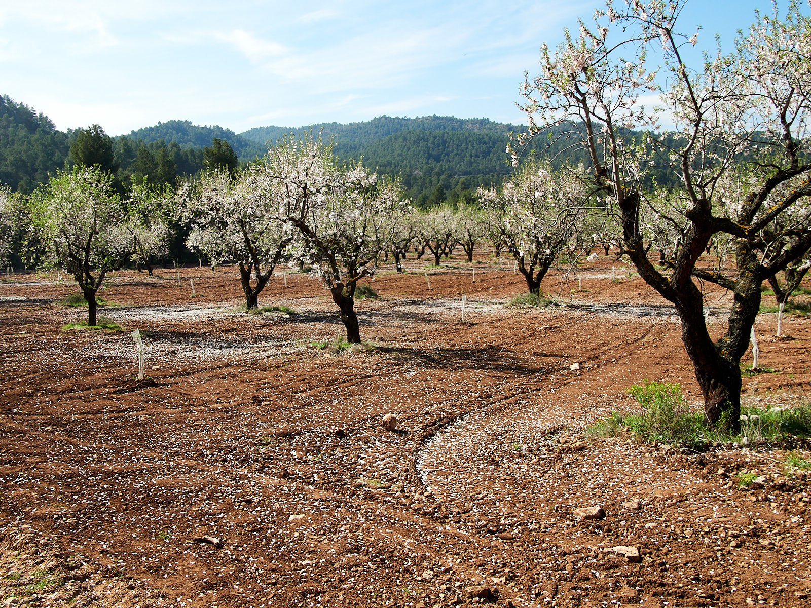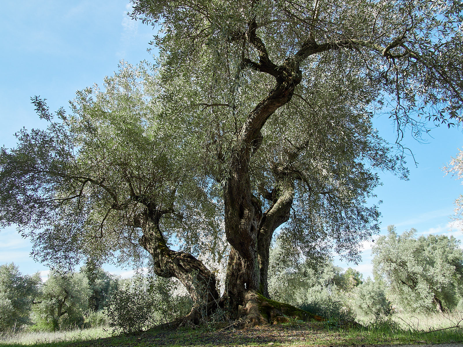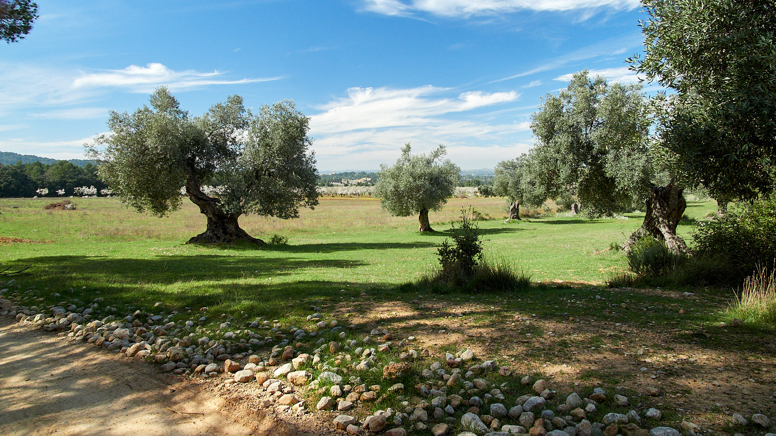 We lopen een gevarieerde route vandaag. Eerst door grotendeels droog bosgebied en heuvelaf. Nu eens omringen ons dennen en eiken, dan weer kleurt en geurt de bloesem van amandelbomen tussen olijfboomgaarden. We ronden drie bergen, die hecht aan elkaar verkleefd lijken en waar geen enkel pad in weet door te dringen. Eromheen is het enige dat kan.