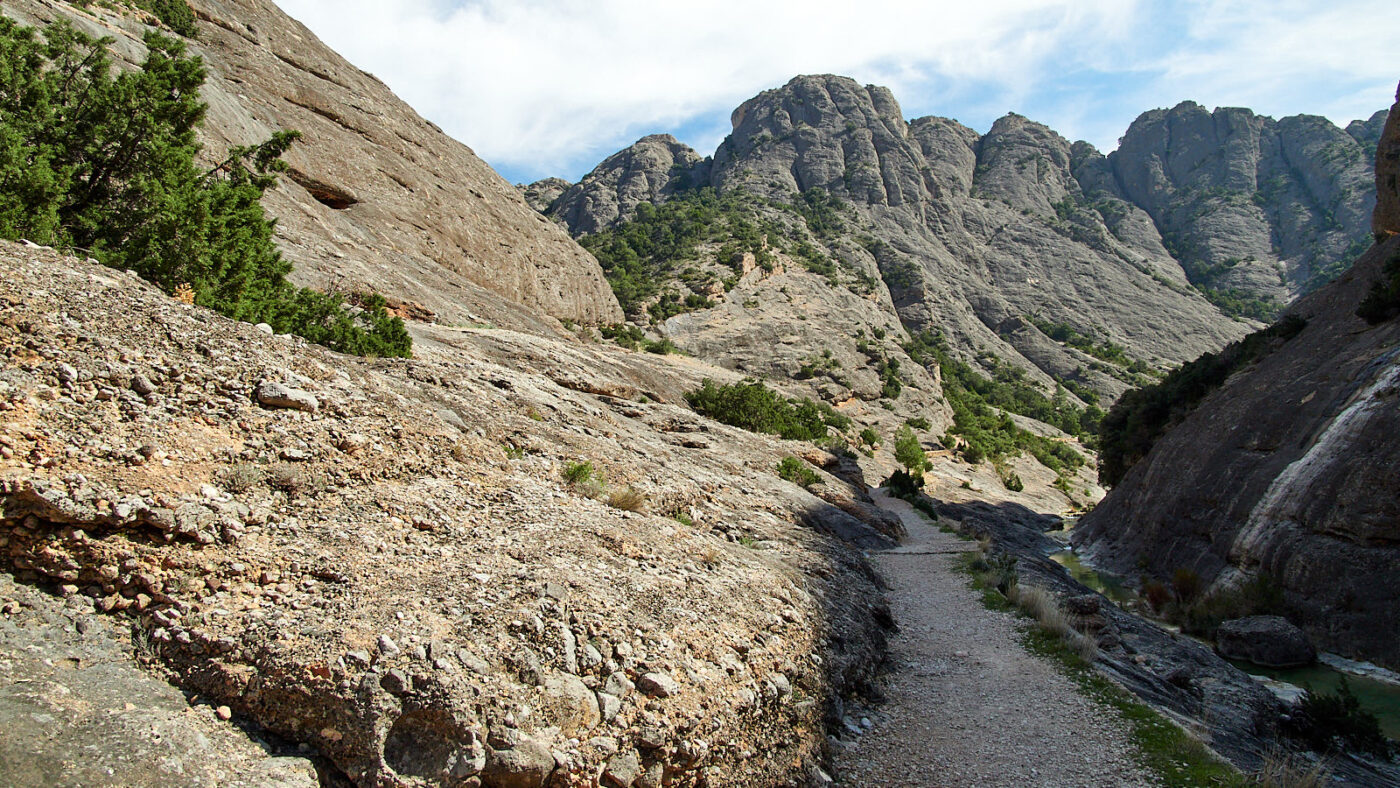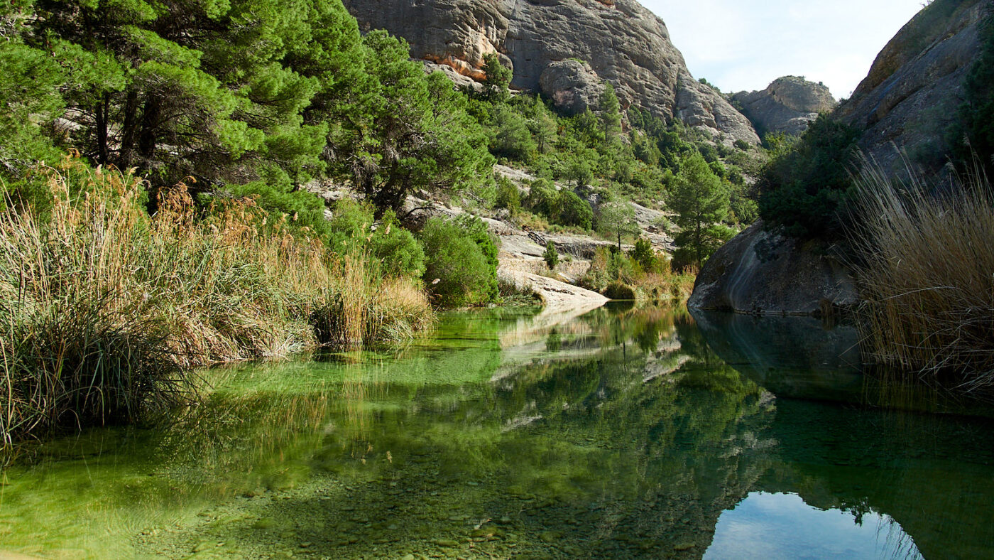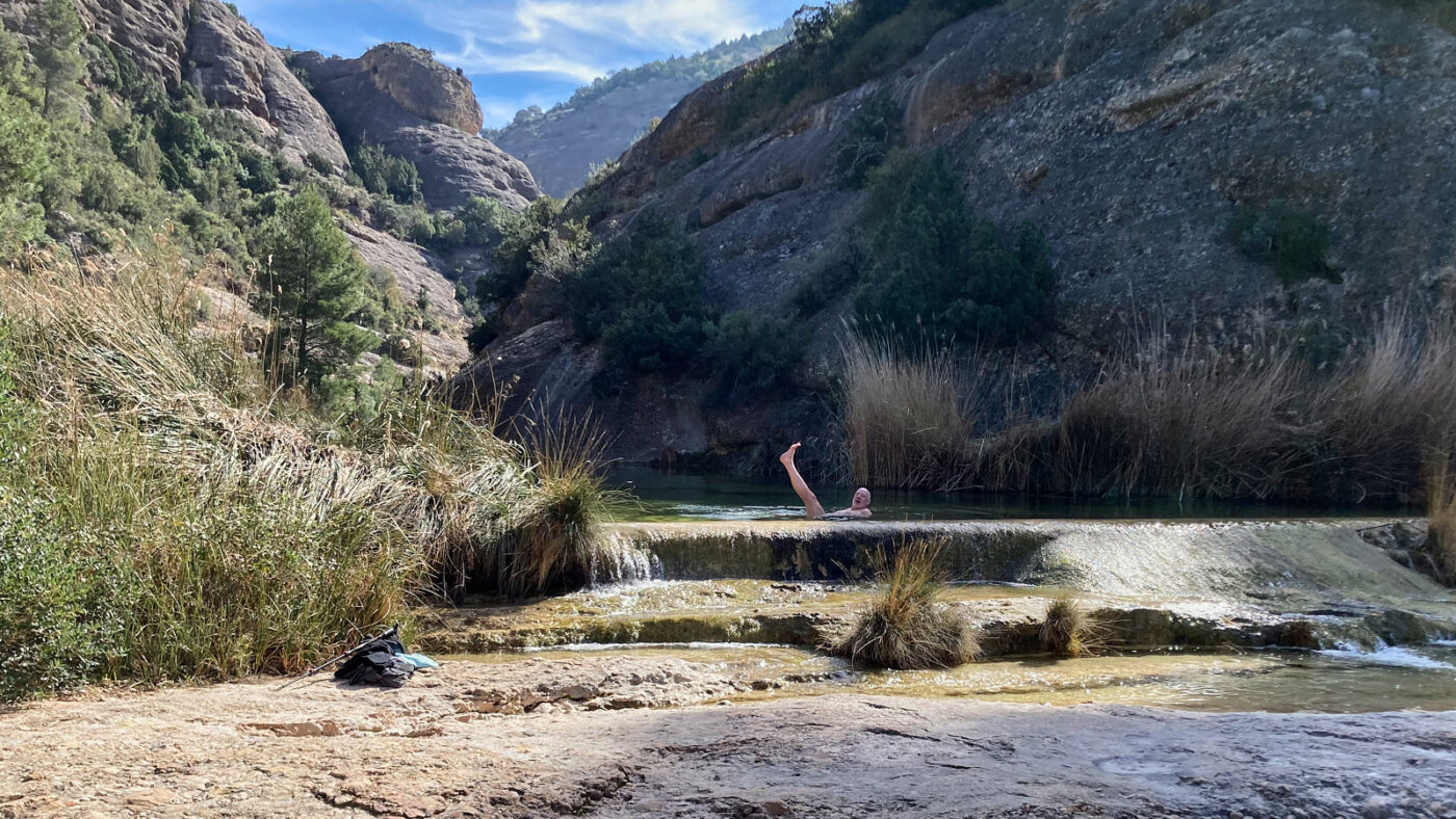 Vrij snel komen we bij de Salt de Ferrasso, een waterval die als vanaf de rand van een schenkkan diep in een kloof omlaag stort. Meestal bekijk je zo’n cascade van onderaf, maar bijzonder genoeg zie je ‘m hier van bovenaf. Je kunt lopen tot aan de rand waar het water onder je in de diepte verdwijnen. Het is ongekend spectaculair en doodeng. We lopen verder, tegen de klok in en langzaam omlaag. Maar toch kijken we nog neer op Horta de San Juan, en natuurlijk op ons ‘eigen’ Arnes. De landerijen kleuren groen op het rood van de aarde. Erdoorheen trekt de rechte streep van de A-231. Dan keert het pad zich naar het zuid-oosten en komen we bij de rivier die nu weliswaar vreedzaam kabbelt, maar die toch in staat moet zijn geweest de machtige kloof te etsen die Barranc de Vall d’Uixó heet; een van de pronkstukken van de hele bergketen. Het is een overweldigende beleving om hier tussen de kolossale rotshellingen aan de oever van dit ogenschijnlijk onschuldige riviertje te lopen, wiens kracht en potentie niettemin bij elke stroomversnelling voelbaar is. Het is het ultieme genot om je onder te dompelen in het ijskoude water van de Toll Blau, een klein kristalhelder meer tussen twee stroomversnellingen, waar het wateroppervlak soms en slechts heel even de hemel weerspiegelt om daarna weer in rimpelingen zijn ware aard te tonen.