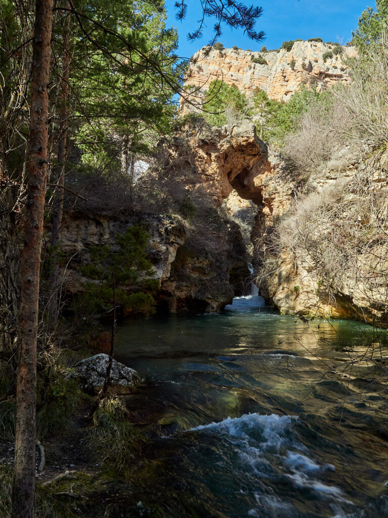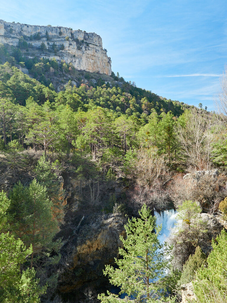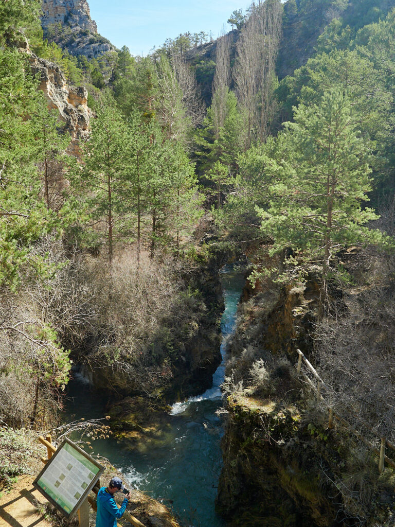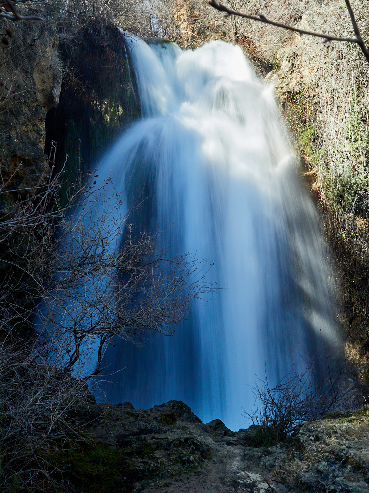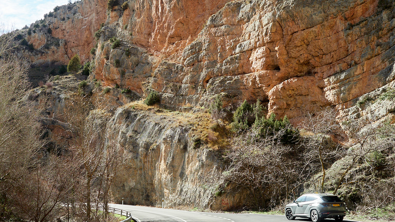 We vervolgen onze autorit. Over de koers hoeven we niet te denken, er is maar één weg. Die volgt de slingerende Rio Guadalaviar. Het is een smalle kloof, waarbij de rotswanden soms net zover overhellen als de weg breed is. Het heeft wel wat griezeligs om daaronder te rijden. Omdat het zo slingert kun je soms niet sneller dan 40km. Toch komen we al snel bij verrassing twee: een waterval van 20 meter.