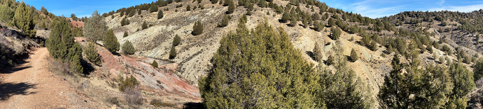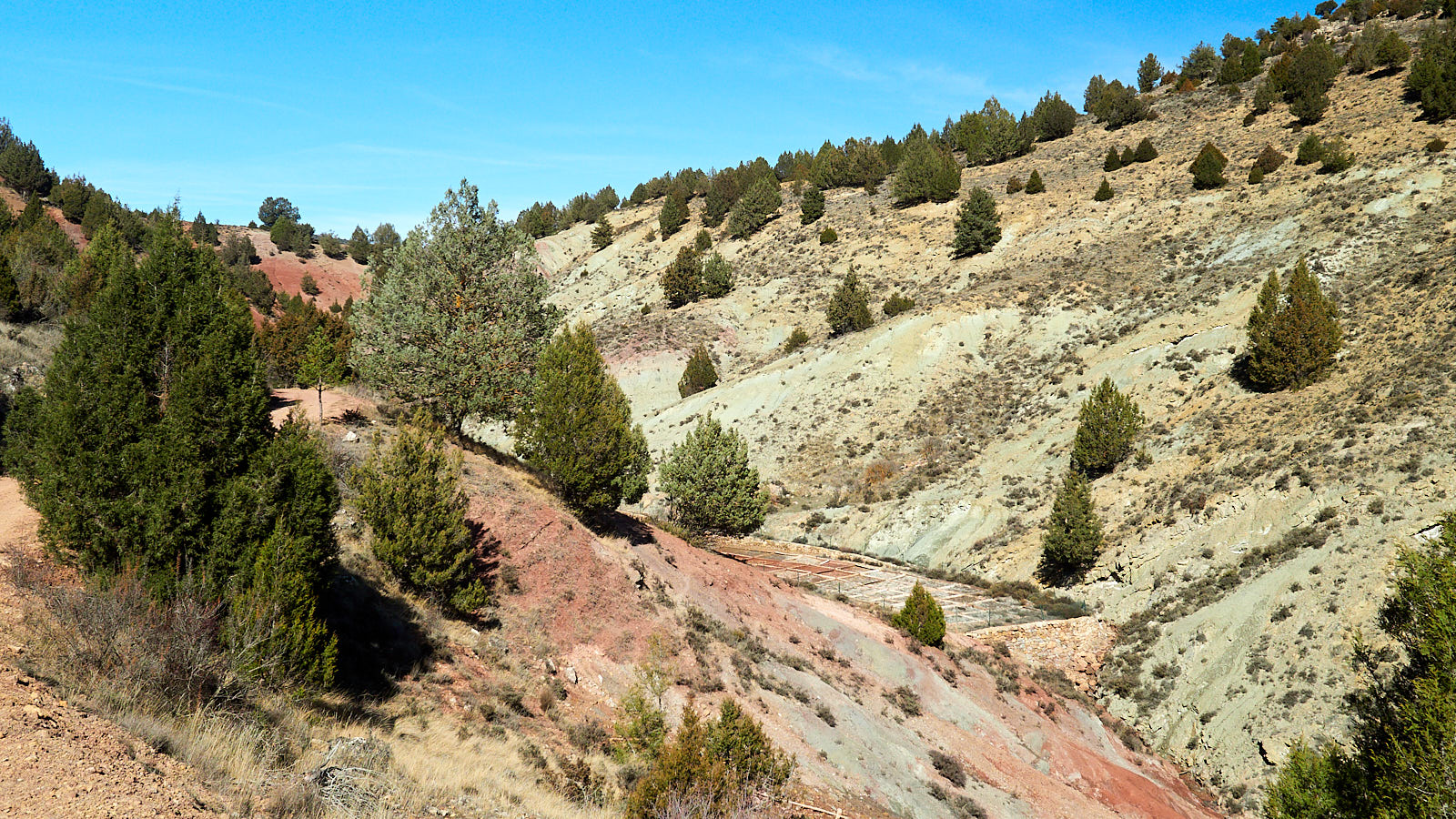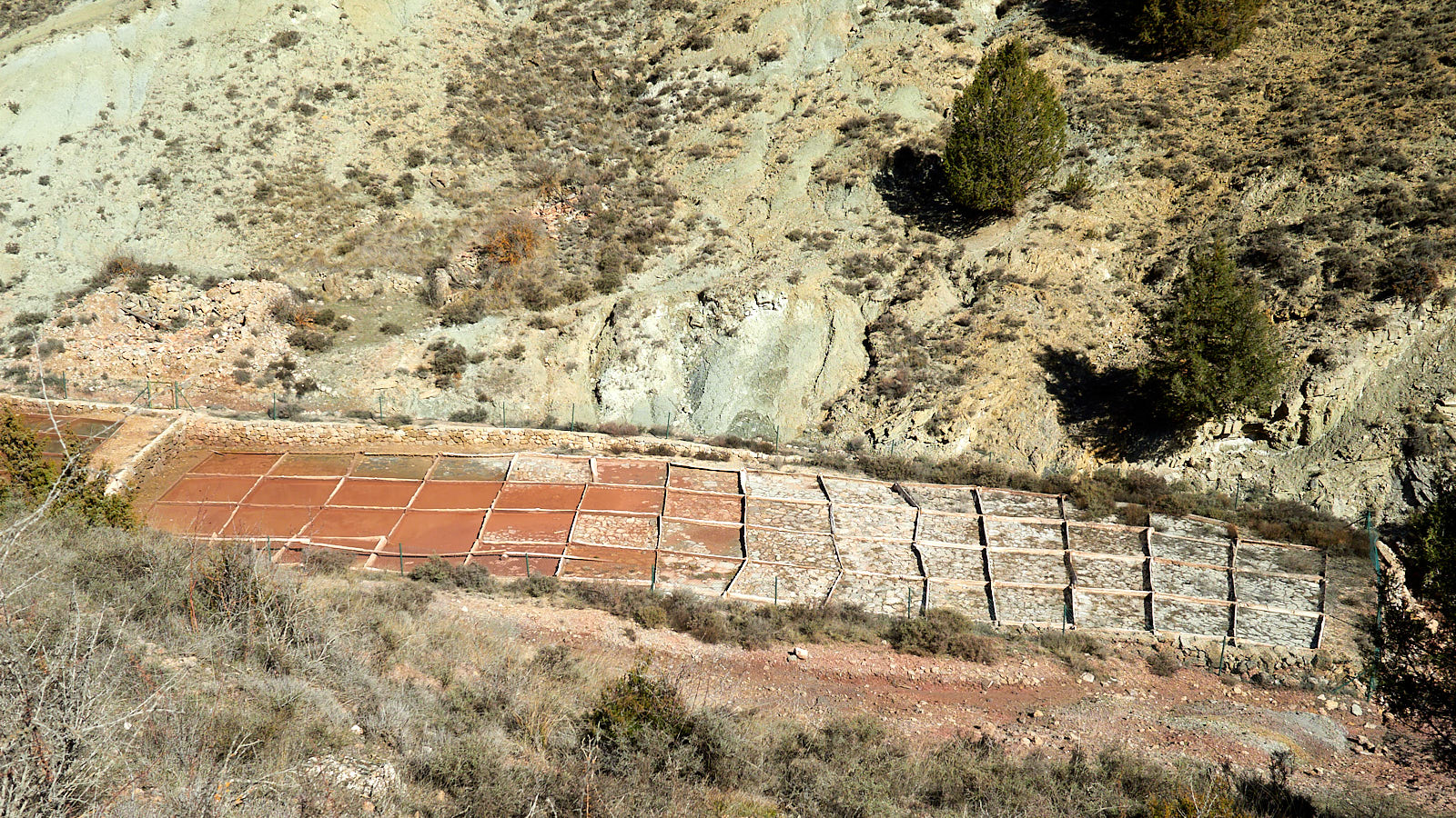 In de buurt is veel natuurschoon en het nodige aan culturele historie. We gaan er gewoon op uit en komen een verrassing tegen: een salinas. Die kennen we van de kuststreken, zoutpannen waarin zeewater verdampt en zout wordt gewonnen. Hoe doen ze dat op 1.000 meter hoogte? We rijden een onverhard weggetje in tot we niet verder mogen. Verder te voet. Het landschap is bizar van kleur. Aan de ene kant rode grond en aan de andere kant groen. Denk er de blauwe lucht bij, met vegerige strepen wolkenwit en je hebt een prachtpanorama. Het was hier kennelijk ook koud vannacht, in de schaduwen van de berm van het pad ligt nog ijs. Na een mooie loop van 20 minuten komen we bij de salinas. Het zijn, net als aan de kust, zoutpannen, maar dan een paar maten kleiner. Een bord legt het uit. De bergen aan weerszijden van de vallei zijn uit lagen opgebouwd. In een van die lagen zit zout in het gesteente. Regenwater drukt het uit de berg en het stroomt langs de bergwand naar beneden. Met dammetjes en gootjes vangen ze de zoutwaterstroom op en voeren die in de zoutpannen. Ook gebruiken ze pozos (putten), waar het zoutwater zich vanzelf in verzamelt, maar dat schijnt langzamer te gaan. De zoutwinning vindt hier al van oudsher plaats, maar was halverwege de 19e eeuw big business. Alleen al rond deze winplaats waren vier fabrieken. Het zout werd gebruikt voor consumptie, voor de leerindustrie en het zouten van hammen, waarmee het nabij gelegen Teruel rijk geworden is. Vanaf 1978 vindt de winning alleen nog als oud ambacht plaats, commercieel is het niet rendabel meer.