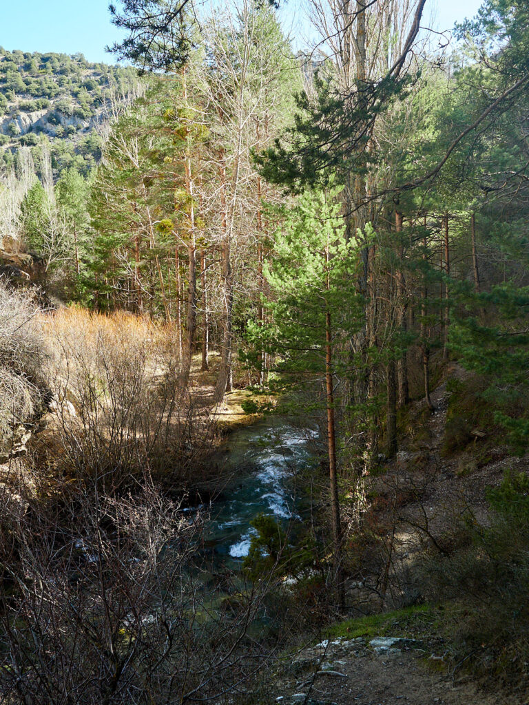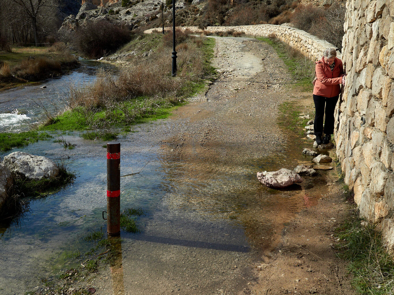 En door, op de oneindig slingerende weg naar het onbekende in de Sierra de Albarracin. De volgende surprise dient zich snel aan. Vlak na het dorp Calomarde kondigt een bord de Ruta del barranco de La Hoz aan. Over dát wandelpad lazen we dat het zich door de nauwe kloof perst, waarbij je soms over aan de bergwand hangende bruggen loopt. Leuk! Auto aan de kant, wandelen maar. Zei ik al dat het water in de rivier hoog staat? Hier staat het zó hoog dat het over het pad stroomt. De eerste overstroming weten we behendig op wankele stenen balancerend te overwinnen. Bij de tweede echter, zuigen Corrine’s sneakers zich gretig vol met ijskoud water. En de derde is een onneembare barrière; het water staat enkeldiep over een afstand van wel twintig meter. Met bergschoenen durven we dat aan, maar niet met onze streetwear. Op de terugweg ververst Corrine het koude water in haar schoenen.