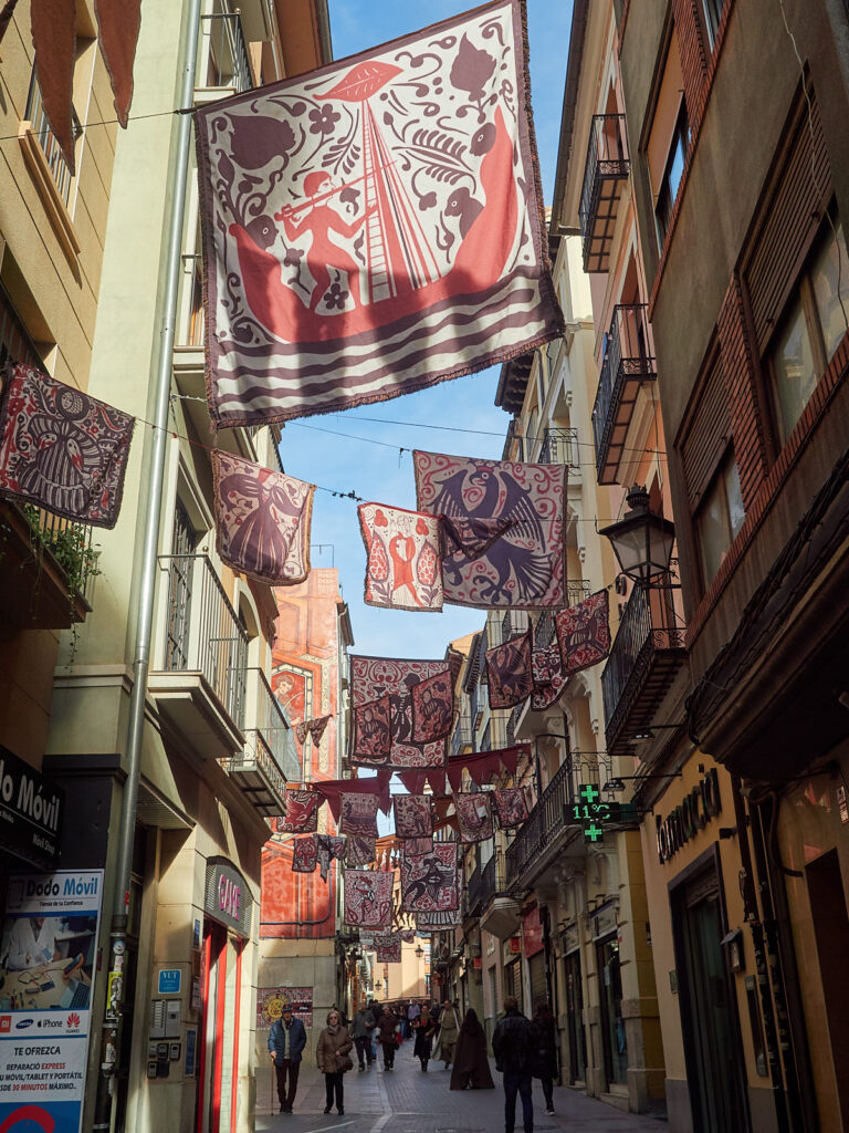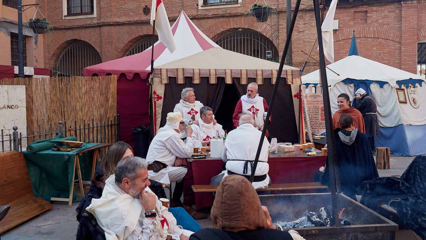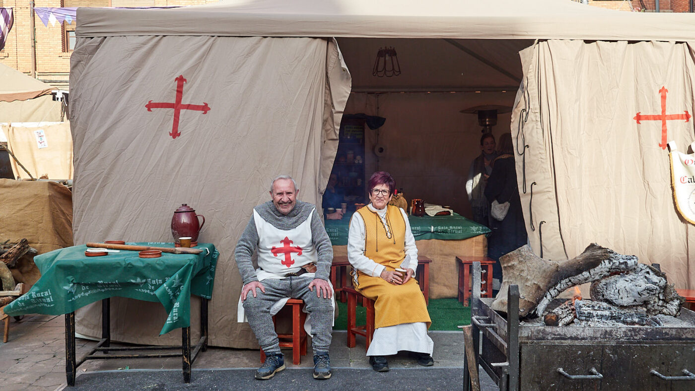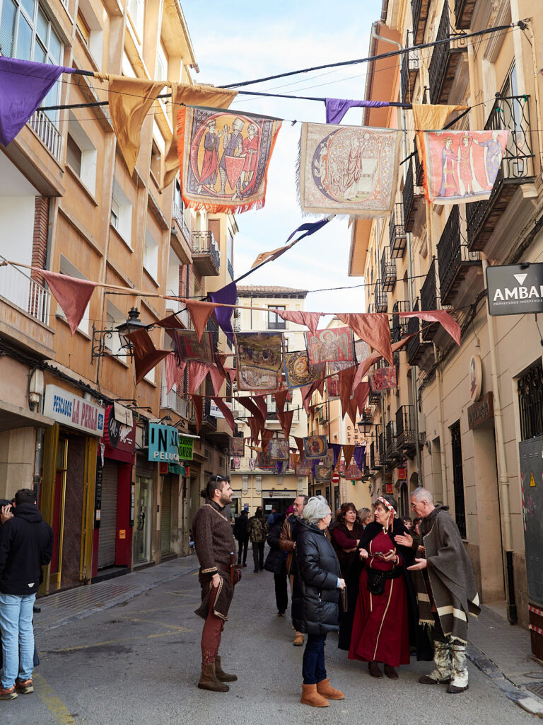 In het oude stadsdeel (Casco historico) zijn veel straten afgezet, flanerende mensen hebben de ruimte ingenomen. Velen daarvan gaan gekleed in schitterende middeleeuwse gewaden. Sommigen als koning of princes, anderen als ridder, boef, berber of ambachtsman. Hele families doen mee aan de verkleedpartij. Overal op de trottoirs en pleinen zijn erfjes afgebakend met houten hekjes of dikke touwen. Daarbinnen staan grote middeleeuwse tenten met historische parafernalia eromheen, zoals bijlen, zetels en lansen en steevast is er een walmend houtvuur met een grote pan aan een driepoot erboven. Heb je geen houtvuur, doe je hier niet mee, kennelijk. Als het in de middeleeuwen ook zo rokerig op straat was, snap je dat de mensen niet oud werden. In de tenten staan lange tafels en daaraan zitten de gasten met drank en eten. Het is een vrolijk tumult, met goede luim en luid gelach. De mensen zijn hartelijk, een paar keer worden we uitgenodigd erbij te komen. Dat durven we niet.