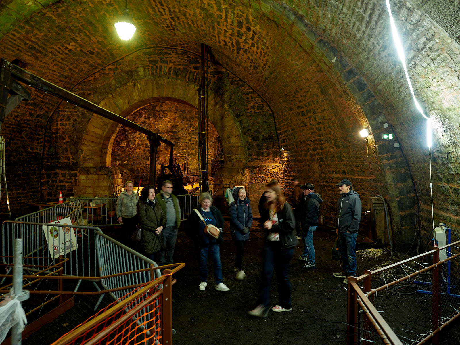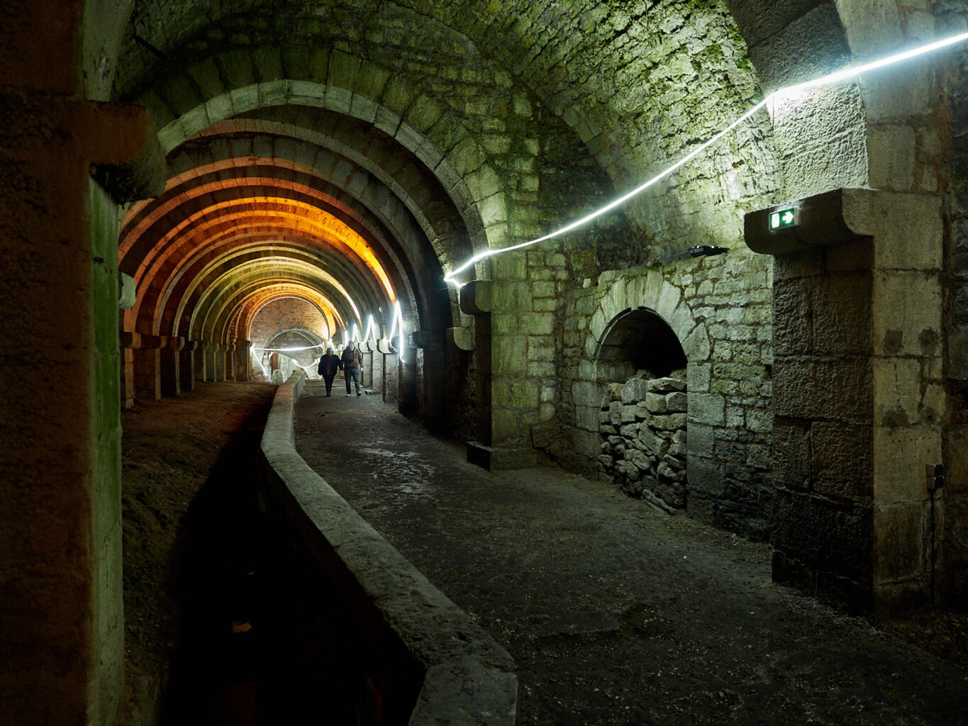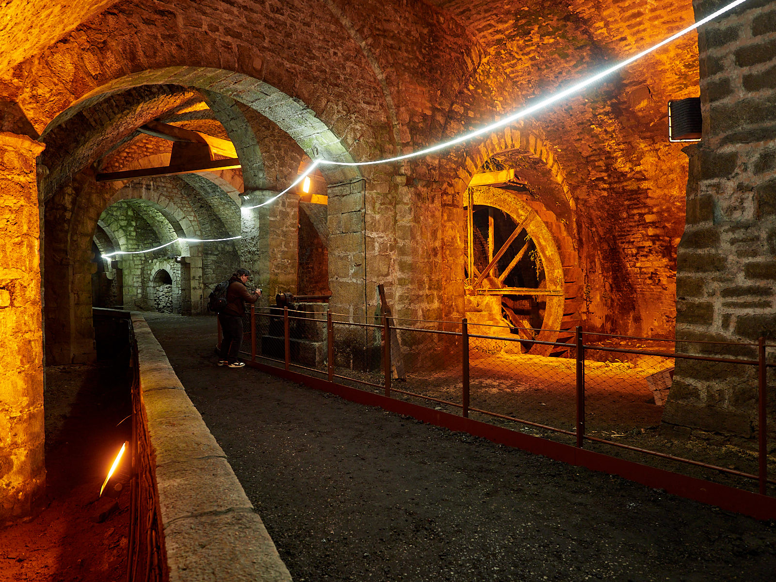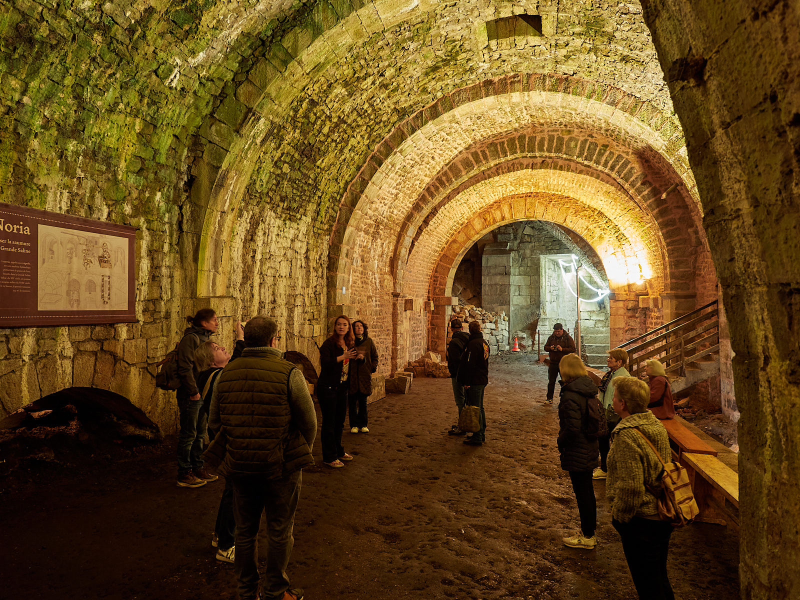 We staan hier op zo’n vierhonderd meter boven zeeniveau en tegelijk een dikke zéshonderd boven dat van de Piëmontiees-Ligurische Oceaan. En dat is nog niet alles. We staan ook nog eens 53 treden ónder het straatniveau van Salins-les-Bains in een 165 meter lang en 12 meter hoog tongewelf dat zo’n 250 jaar geleden werd uitgehouwen in de krijt- en kalksteenlagen van het Juragebergte. Er loopt een ondergronds beekje langs een van de zijden van het gewelf, het kabbelt kalm in het halfduister een halve meter lager dan de zwarte bodem waarop we staan door een natuurstenen kanaal, dat zichtbaar berekend is op veel meer volume. Een modern LED-lint verlicht nu een groot deel van de carverne, maar toen het hier in bedrijf was, bestond elektriciteit nog niet. De brandstofmotor was nog niet uitgevonden, zelfs de stoommachine was nog experimenteel.