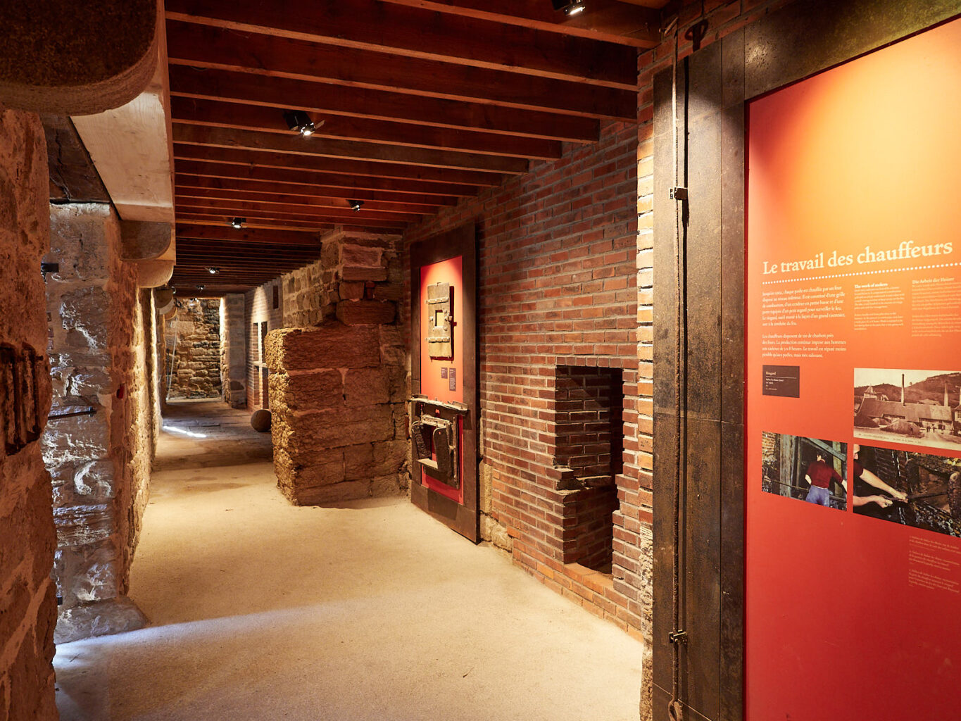 Op grondniveau bouwden ze een grote oven, waarin ze steenkool konden verbranden om hitte te genereren. De hete rook steeg door een lange ondervloer naar een schoorsteen twintig meter verderop. Tussen de oven en de schoorsteen stond boven die ondervloer op ijzeren palen een gigantische pan van gietijzeren platen die aan elkaar geklonken waren. Dit is duidelijk afgekeken van de verwarming in Romeinse baden. In die pan goot men de pekel en dan: verdampen maar. Een meter boven de pan hing een ‘afdruipdak’ van houten planken. Als het zout in de pekel begon te kristalliseren, schraapten en schepten mannen de plakkerige brij uit de pan en wierpen het bovenop het afdruipdak, alwaar het verder kon drogen. Het behoeft geen betoog dat het verschrikkelijk moet zijn geweest om naast die borrelende zoutpan met lange harken en scheppen urenlang op louter spierkracht tonnen zout omhoog te halen. Op foto’s zien we pezige mannen met ontbloot bovenlijf aan het werk, geen grammetje vet. Dit werk werd tot 1962 op deze manier gedaan, zonder enige vorm van mechanisatie. De gids vertelt erover met onverholen schaamte. Niet dat dát de reden was om ermee te stoppen, die was veel prozaïscher: het rendeerde niet meer. Nu wordt alleen nog op bescheiden schaal zout opgepompt door een polsdikke kunststof buis. Je kunt het kopen in het museumwinkeltje. Even verderop in de straat stond nog een kleinere zoutfabriek (petite saline), maar die werd al in 1854 omgebouwd tot kuuroord. Daar wordt het zoute water nog steeds opgepompt om er in te badderen.