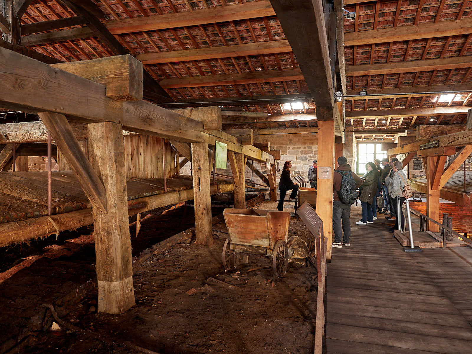 Vijftig meter vóór het ene uiteinde staat een immens waterrad. Houten goten komen vanonder de bogen uit de hoogte en voeden het met water. Dat brengt een as aan het draaien, die op zijn beurt een lange balk, op meebewegende stutten heen en weer laat bewegen. Aan het uiteinde daarvan wordt de horizontale beweging omgezet in een verticale. Ik herken er een ja-knikker in. Een zuiger in een geboord gat, dat nog eens 246 meter in de diepte verdwijnt, veroorzaakt een vacuüm en zo wint men het kostbare vocht waar het allemaal om te doen is: pekel.